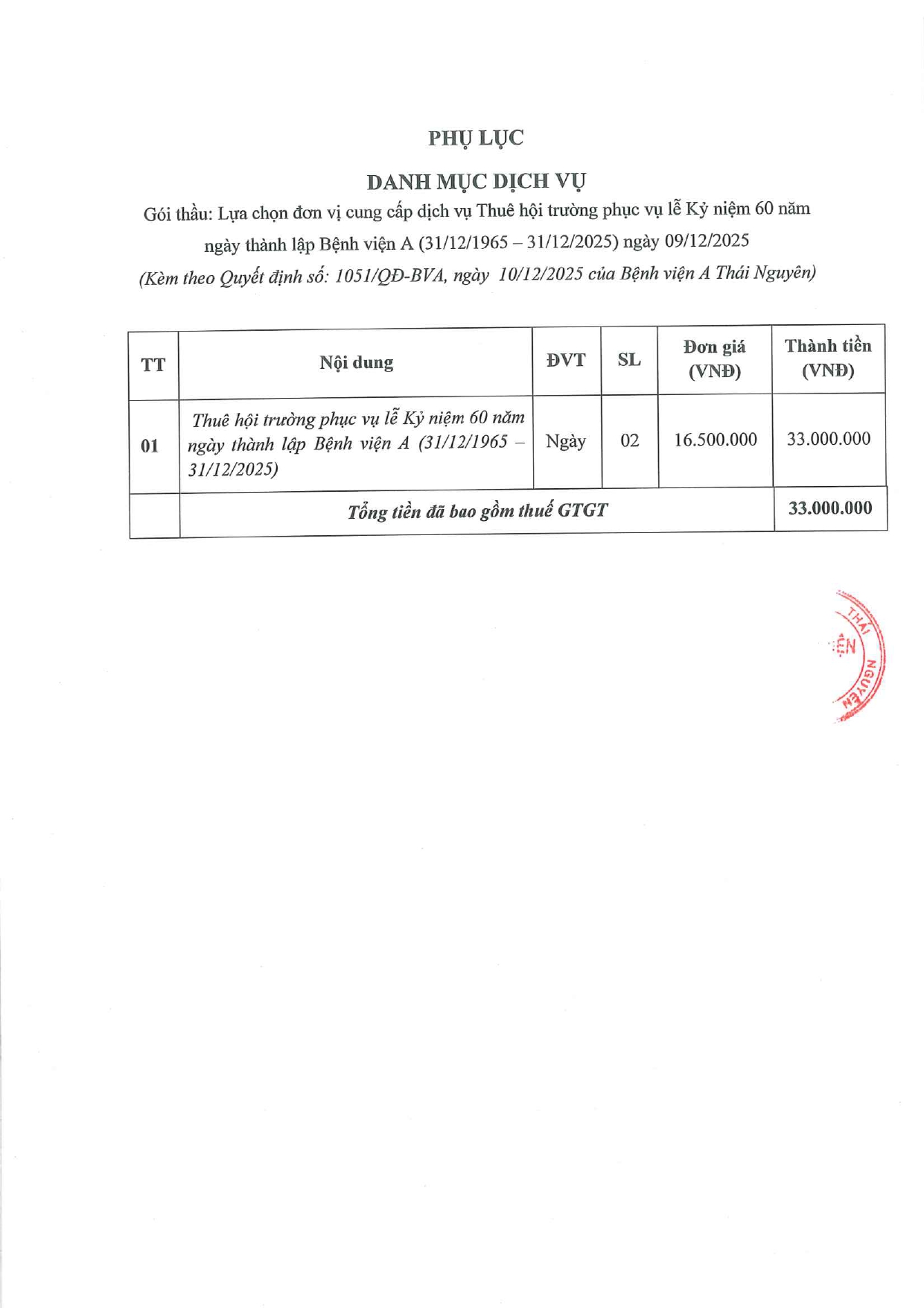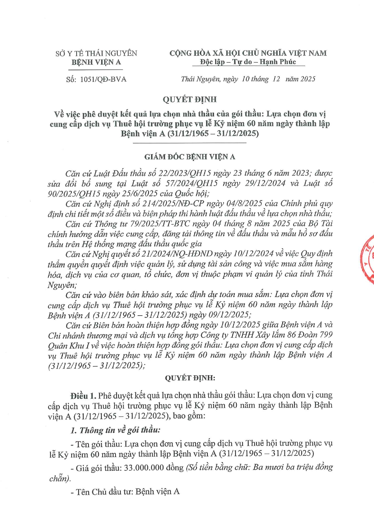 Quyết định về việc phê duyệt lựa chọn nhà thầu gói thầu: Lựa chọn đơn vị cung cấp dịch vụ Thuê hội trường phục vụ Lễ Kỷ niệm 60 năm ngày thành lập Bệnh viện A (31/12/1965 - 31/12/2025)