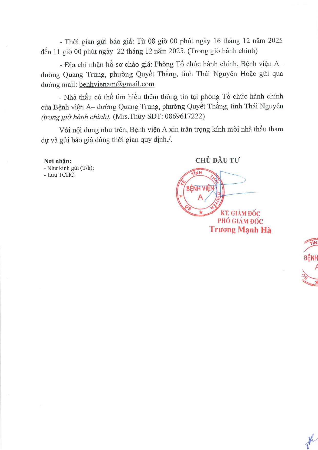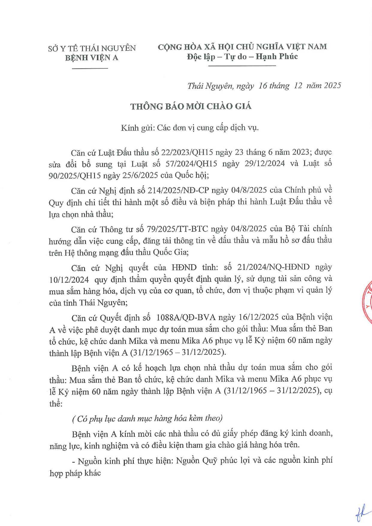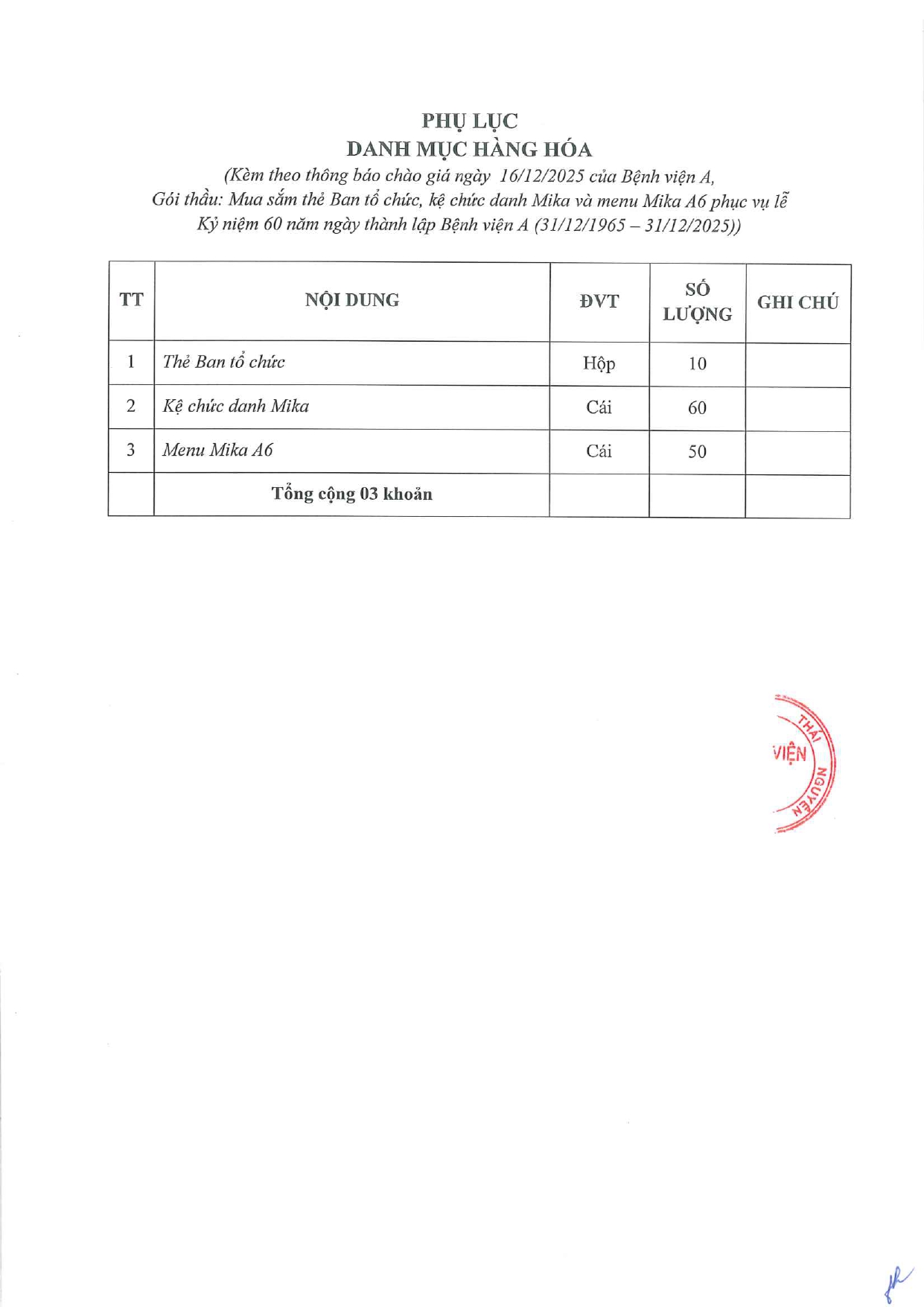 Thông báo mời chào giá gói thầu: Mua sắm thẻ Ban tổ chức, kệ chức danh Mika và Menu Mika A6 phục vụ lễ Kỷ niệm 60 năm ngày thành lập Bệnh viện A (31/12/1965 - 31/12/2025)
