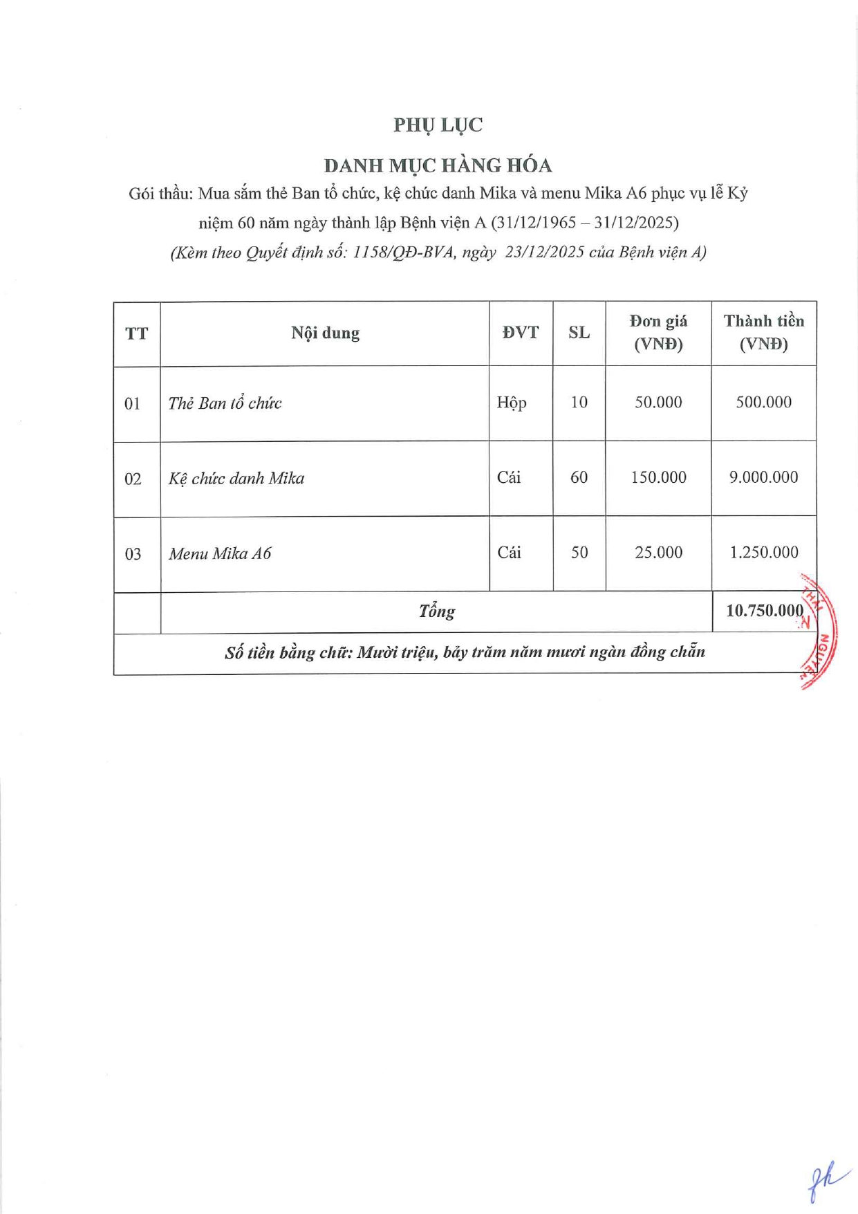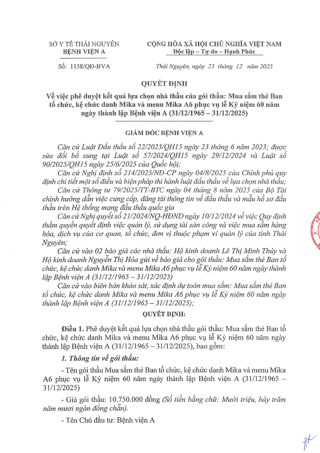 Quyết định về việc phê duyệt kết quả lựa chọn nhà thầu gói thầu: Mua sắm thẻ Ban tổ chức, kệ chức danh Mika và menu Mika A6 phục vụ lễ Kỷ niệm 60 năm ngày thành lập Bệnh viện A (31/12/1965 - 31/12/2025)
