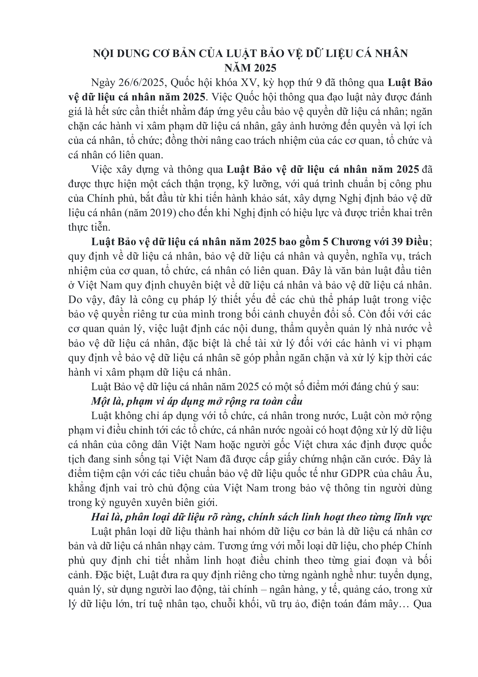 Nội dung cơ bản của Luật Bảo vệ dữ liệu cá nhân năm 2025