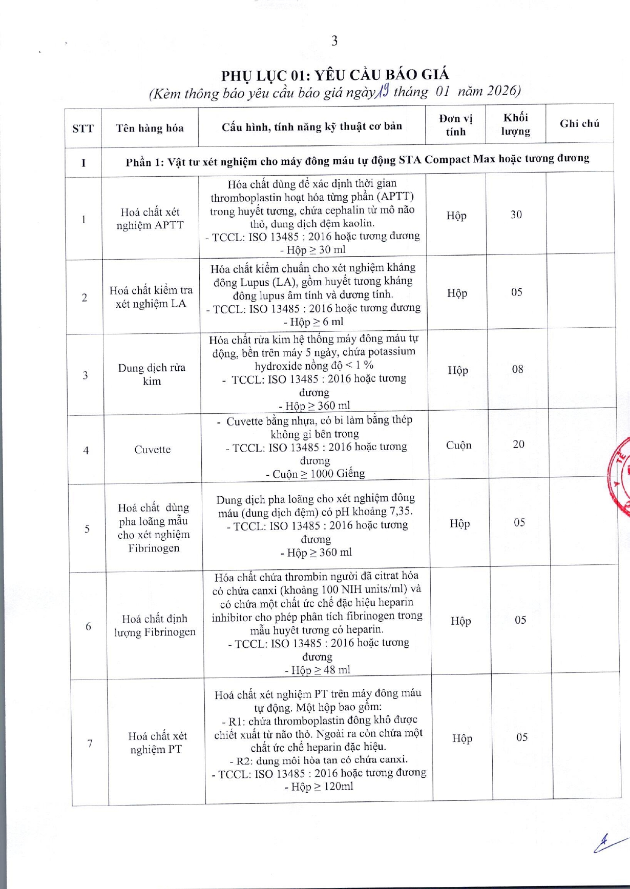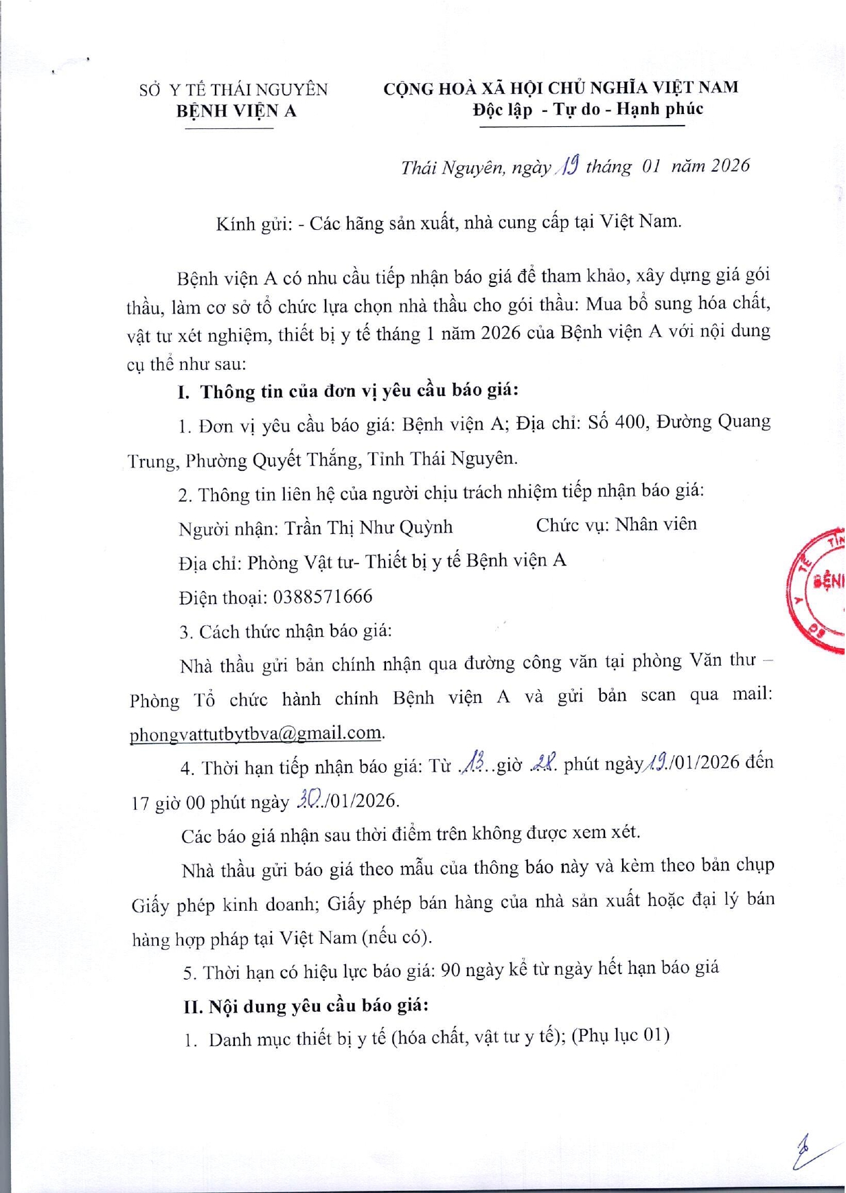 Thông báo mời chào giá gói thầu: Mua bổ xung hóa chất, vật tư xét nghiệm, thiết bị y tế tháng 1 năm 2026 của Bệnh viện A