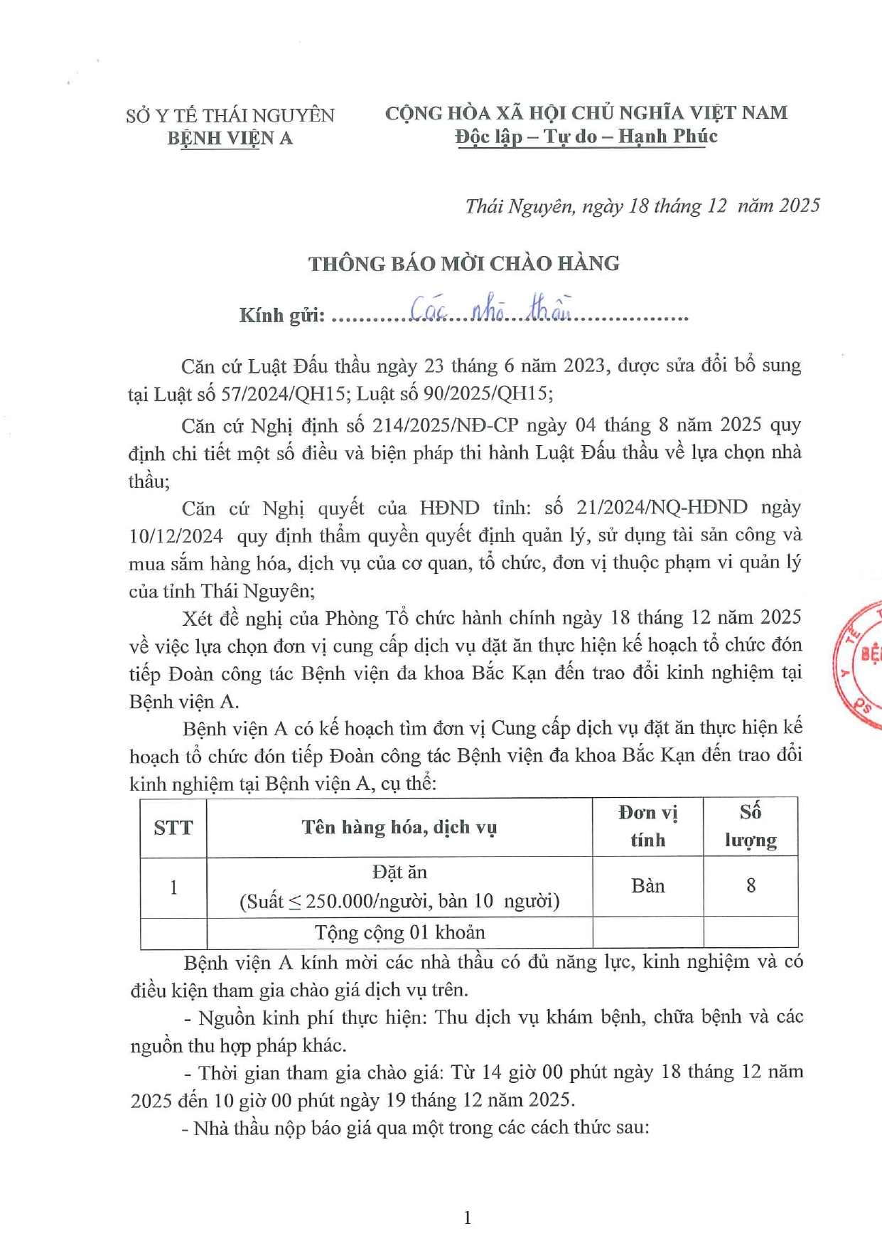 Thông báo mời chào hàng gói thầu: Cung cấp dịch vụ đặt ăn đón tiếp Đoàn công tác Bệnh viện đa khoa Bắc Kạn đến trao đổi kinh nghiệm tại Bệnh viện A