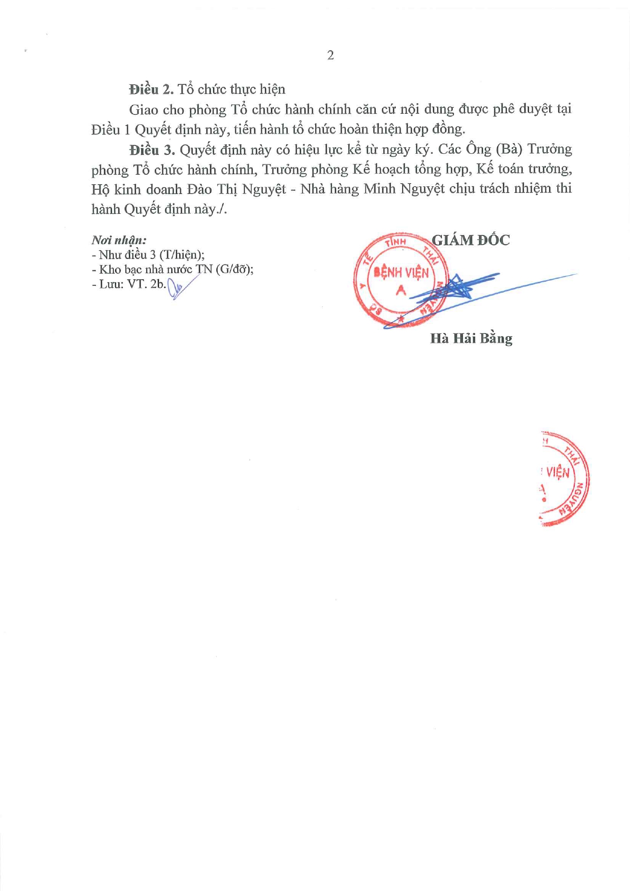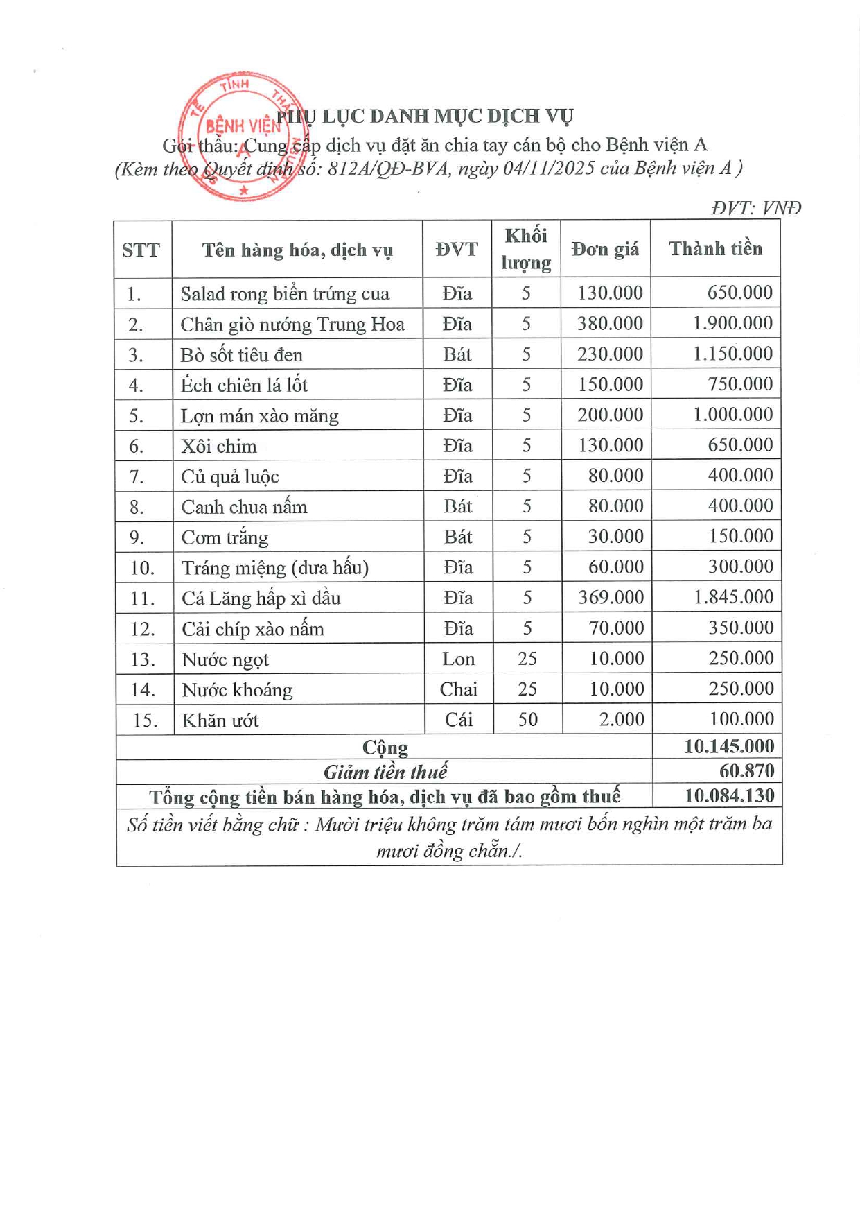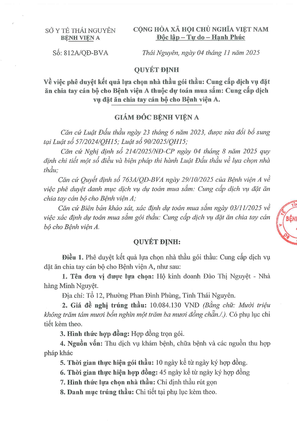 Quyết định về việc phê duyệt kết quả lựa chọn nhà thầu gói thầu: Cung cấp dịch vụ đặt ăn chia tay cán bộ cho Bệnh viện A