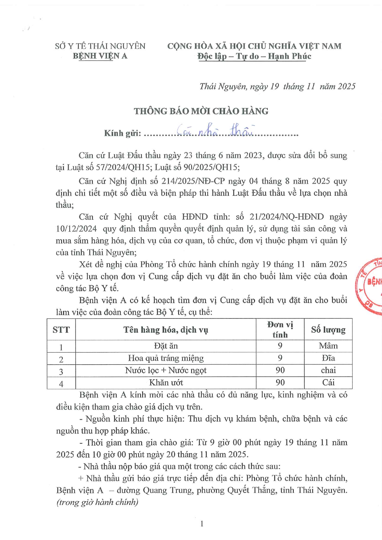 • Thông báo mời chào hàng gói thầu: Thay thế linh kiện máy in, mực in phục vụ công tác chuyên môn khám chữa bệnh tại Bệnh viện A ( 09/01/2026)