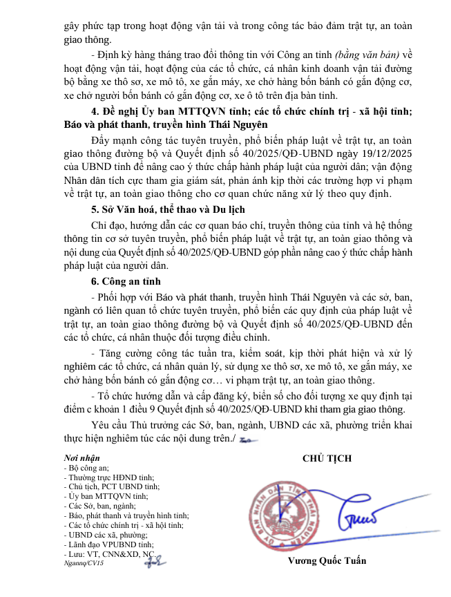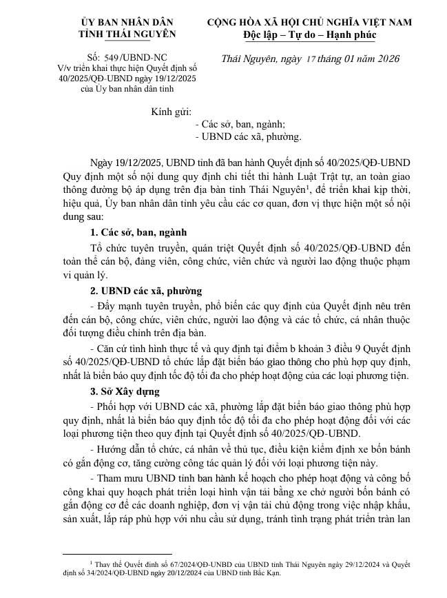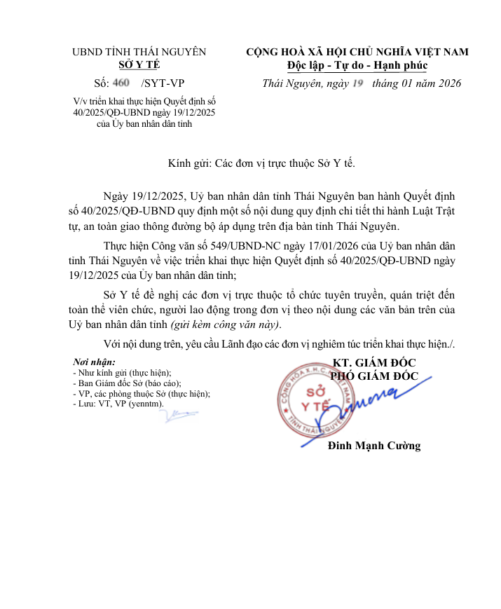 Thực hiện Quyết định số 40/2025/QĐ-UBND ngày 19/12/2025 của Ủy ban nhân dân tỉnh Thái Nguyên quy định chi tiết một số nội dung thi hành Luật Trật tự, an toàn giao thông đường bộ áp dụng trên địa bàn tỉnh Thái Nguyên; đồng thời triển khai Công văn số 549/UBND-NC ngày 17/01/2026 của Ủy ban nhân dân tỉnh Thái Nguyên và văn bản số 460/SYT-VP của Sở Y tế tỉnh Thái Nguyên, Bệnh viện A đã tổ chức tuyên truyền, quán triệt một cách toàn diện, nghiêm túc và thực chất đến toàn thể viên chức, người lao động trong đơn vị, tập trung vào các nội dung trọng tâm sau: