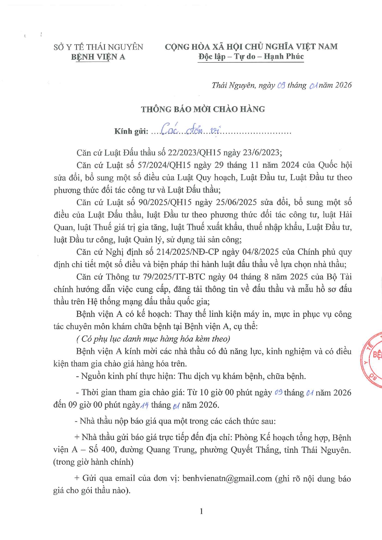 • Thông báo mời chào giá gói thầu: Mua sắm vật tư văn phòng phẩm phục vụ khám sức khỏe cho Bệnh viện A ( 05/01/2026)