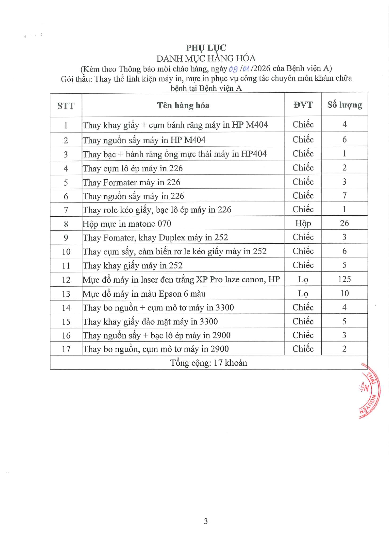 Thông báo mời chào hàng gói thầu: Thay thế linh kiện máy in, mực in phục vụ công tác chuyên môn khám chữa bệnh tại Bệnh viện A