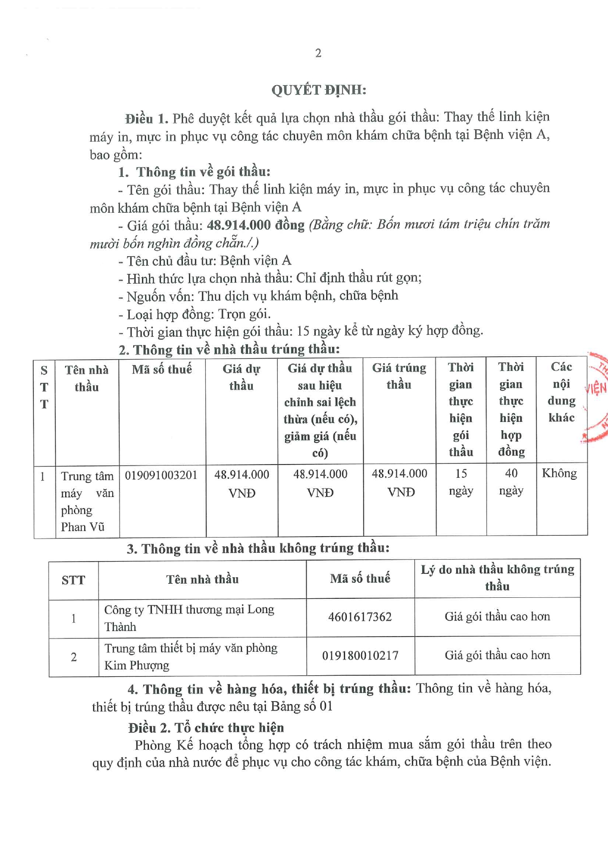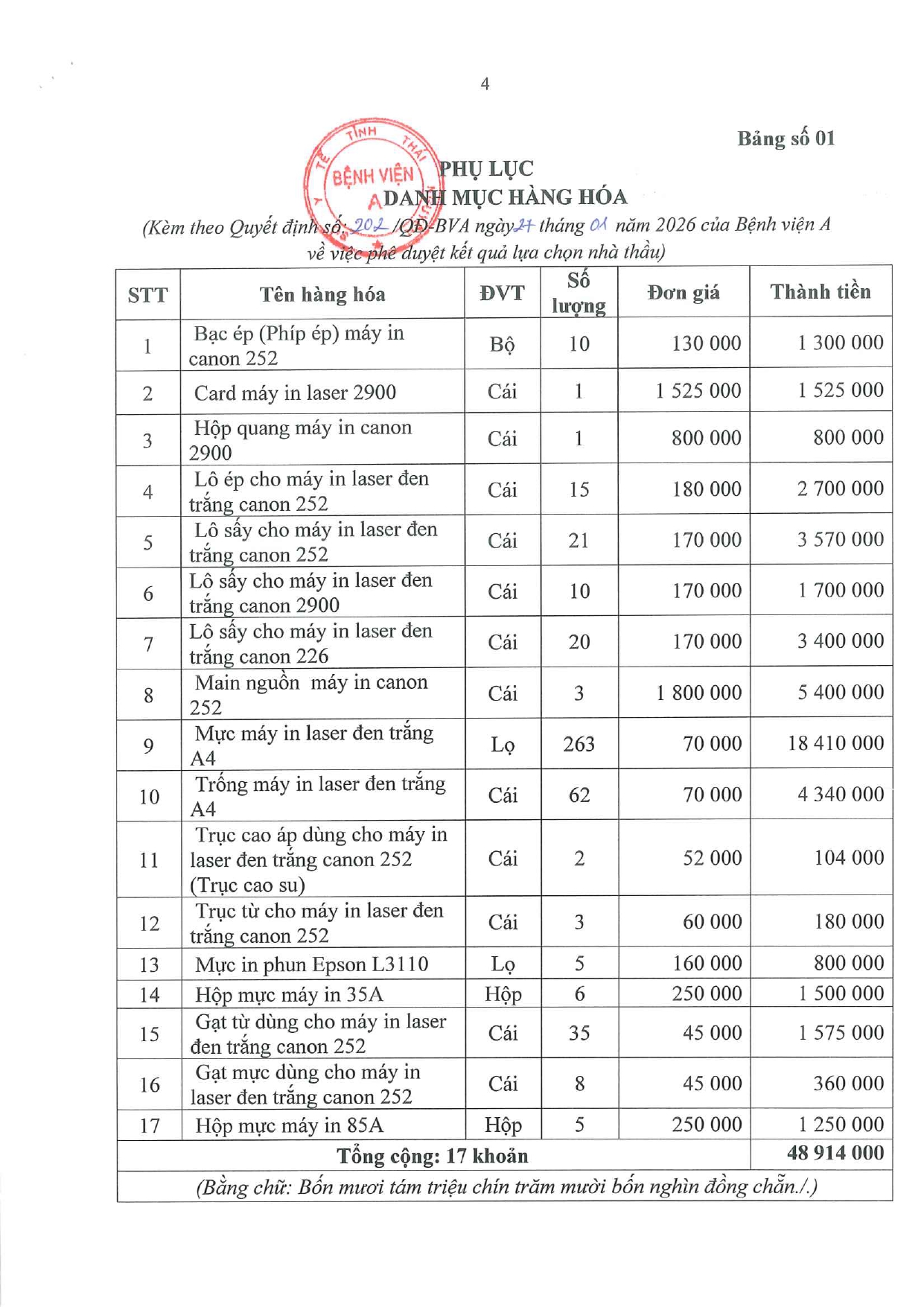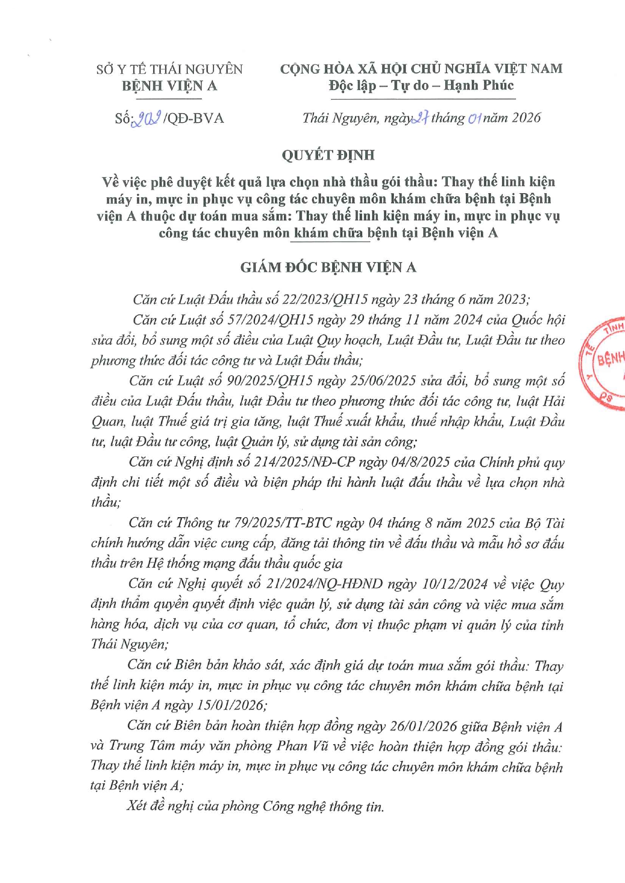 Quyết định về việc phê duyệt kết quả lựa chọn nhà thầu gói thầu: Thay thế linh kiện máy in, mực in phục vụ công tác chuyên môn khám chữa bệnh tại Bệnh viện A