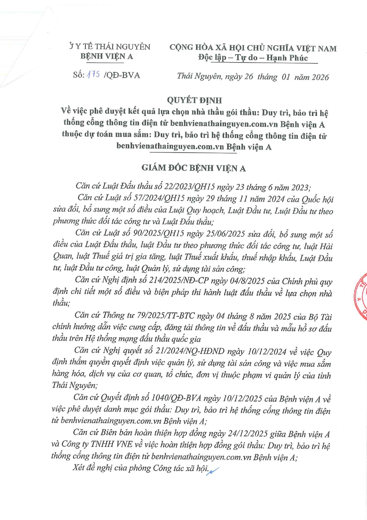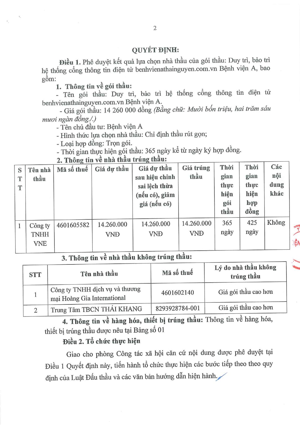 Quyết định về việc phê duyệt kết quả lựa chọn nhà thầu gói thầu: Duy trì, bảo vệ hệ thống cổng thông tin điện tử benhvienathainguyen.com.vn Bệnh viện A