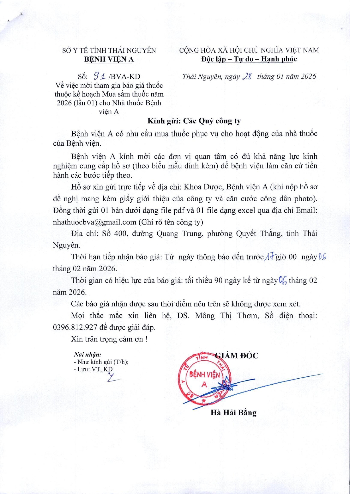 • Quyết định về việc phê duyệt kết quả lựa chọn nhà thầu gói thầu: Duy trì, bảo vệ hệ thống cổng thông tin điện tử benhvienathainguyen.com.vn Bệnh viện A ( 26/01/2026)