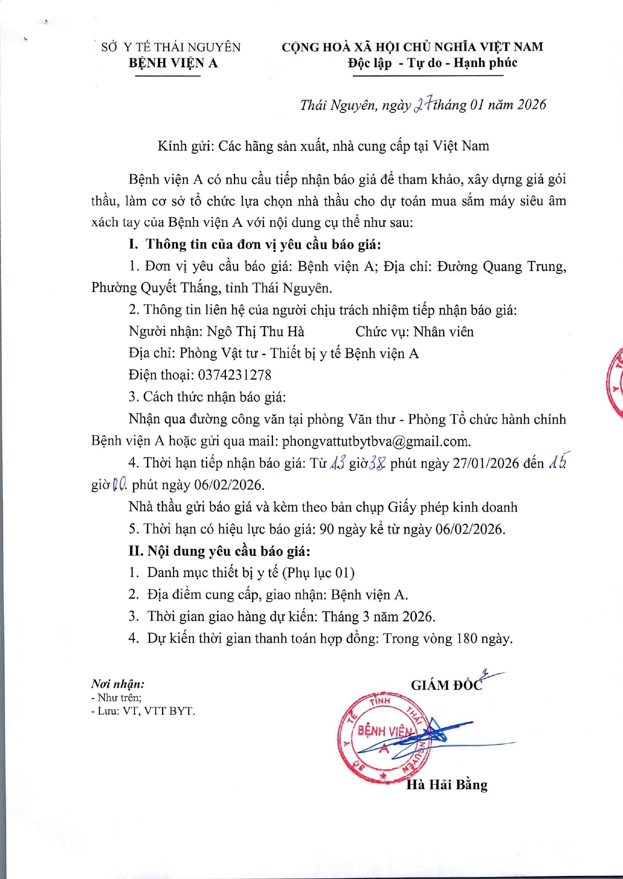 • Thông báo mời chào giá gói thầu: Mua bổ xung hóa chất, vật tư xét nghiệm, thiết bị y tế tháng 1 năm 2026 của Bệnh viện A ( 19/01/2026)