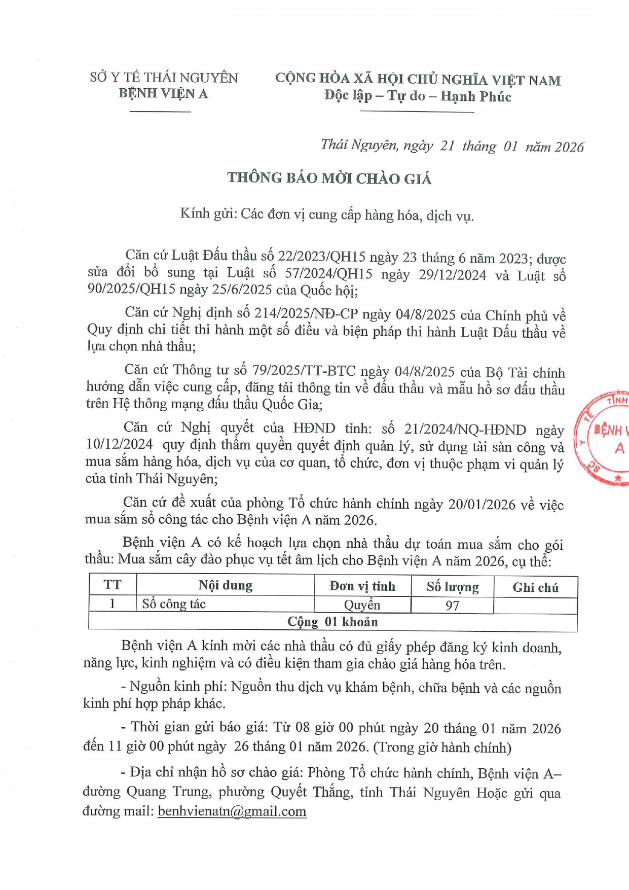 Thông báo chào giá gói thầu: Mua sắm cây đào phục vụ tết âm lịch cho Bệnh viện A năm 2026