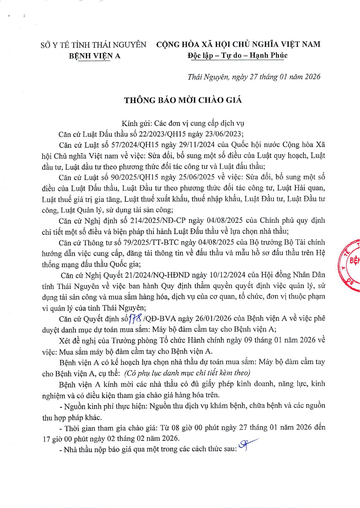 • Thông báo mời chào giá gói thầu: Mua sắm máy siêu âm xách tay của Bệnh viện A ( 29/01/2026)