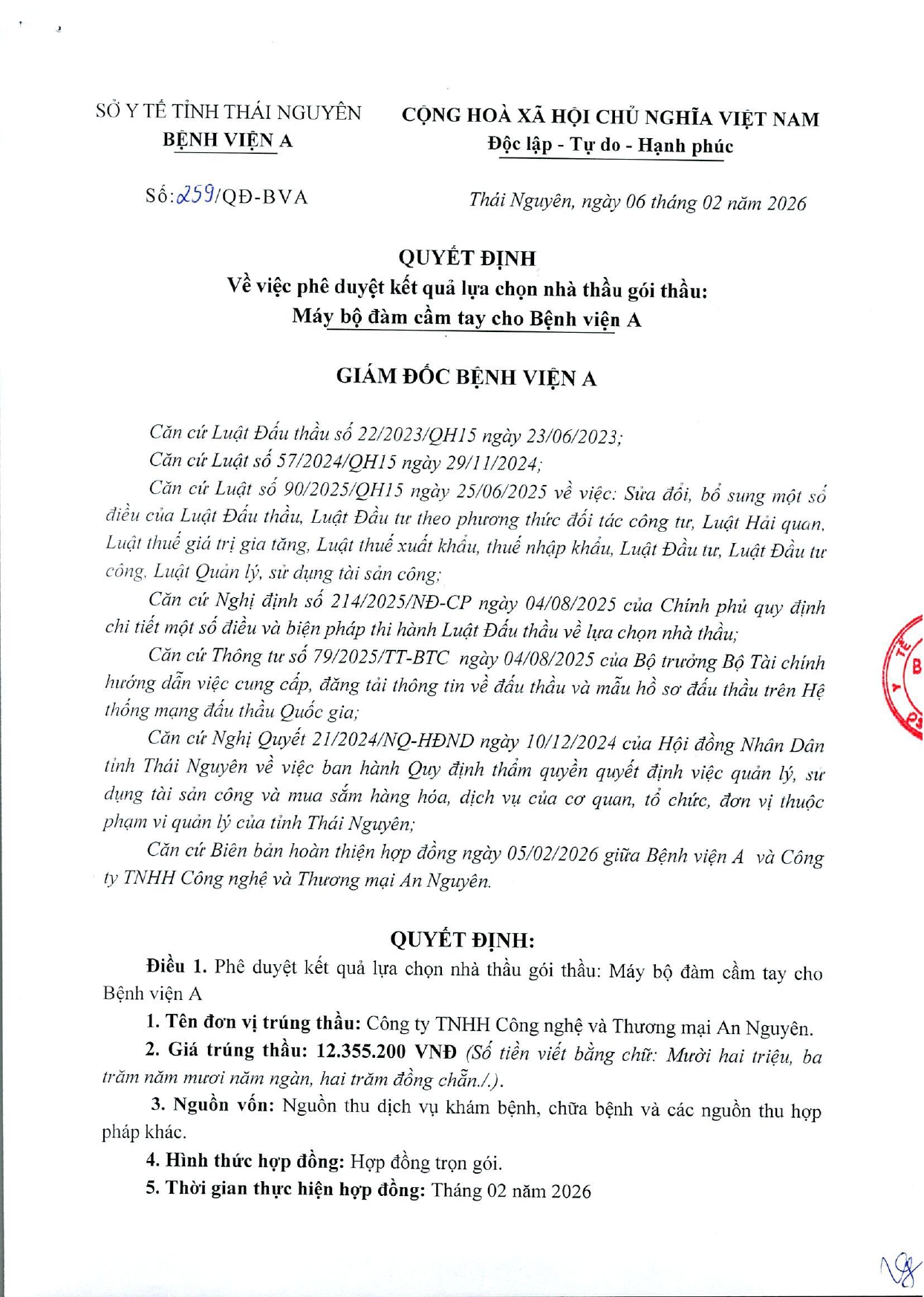 Quyết định về việc phê duyệt kết quả lựa chọn nhà thầu gói thầu: Máy bộ đàm cầm tay cho Bệnh viện A
