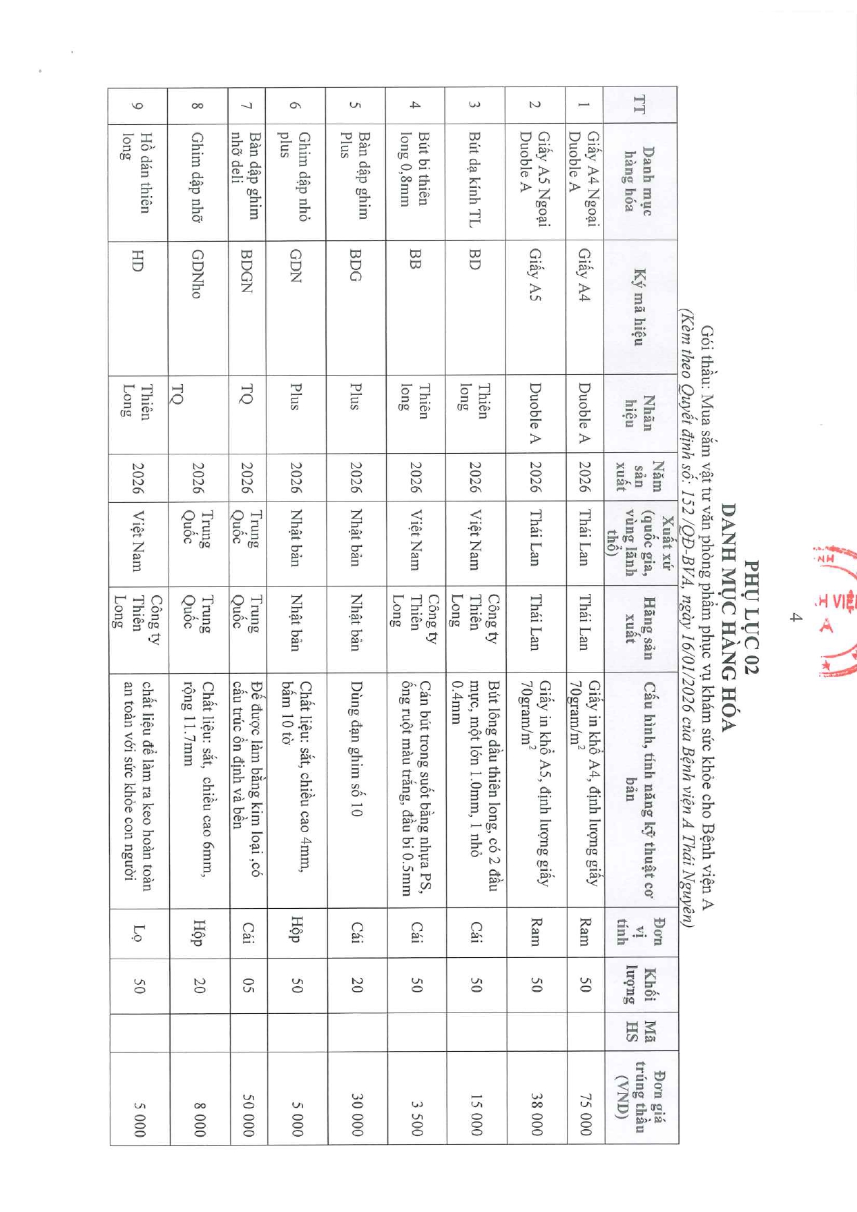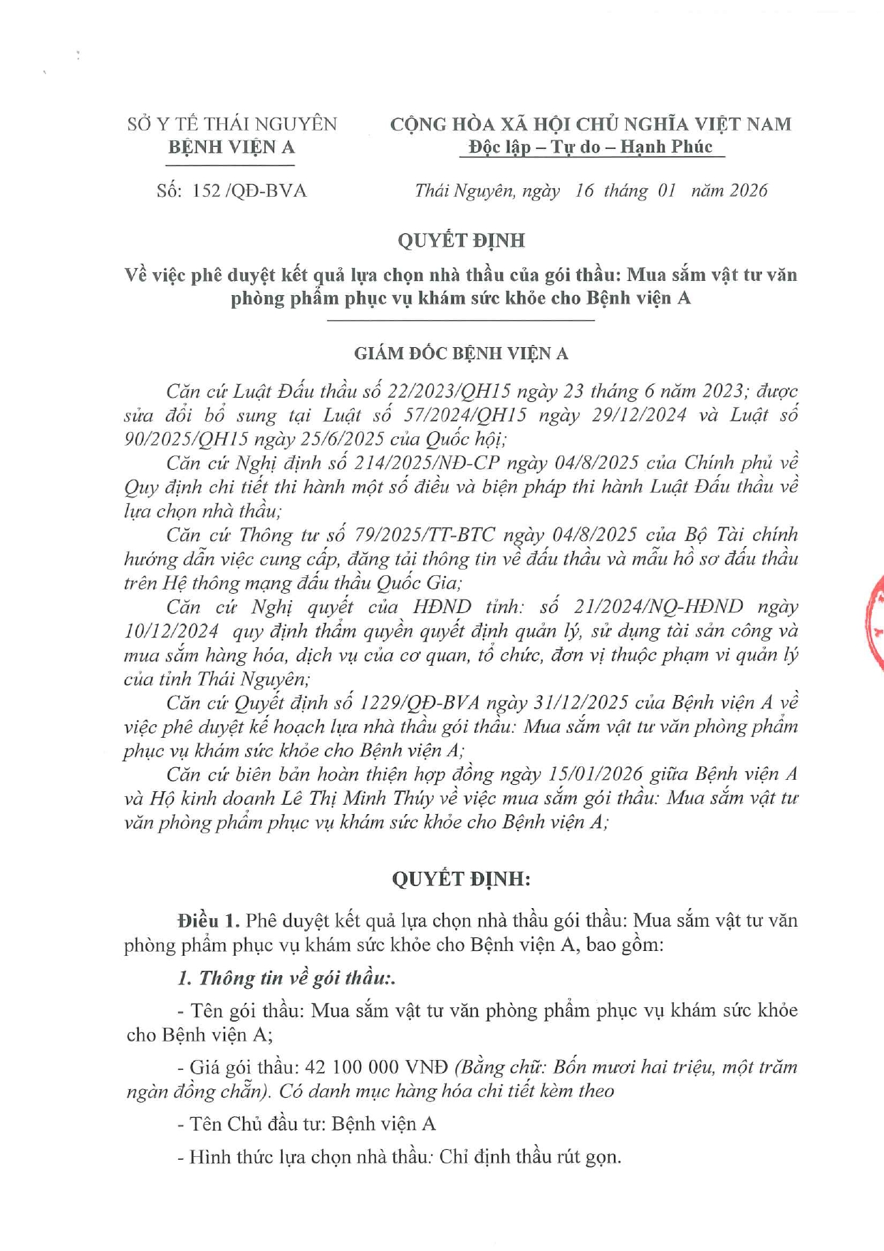 Quyết định về việc phê duyệt kết quả lựa chọn nhà thầu của gói thầu: Mua sắm vật tư văn phòng phẩm phục vụ khám sức khỏe cho Bệnh viện A