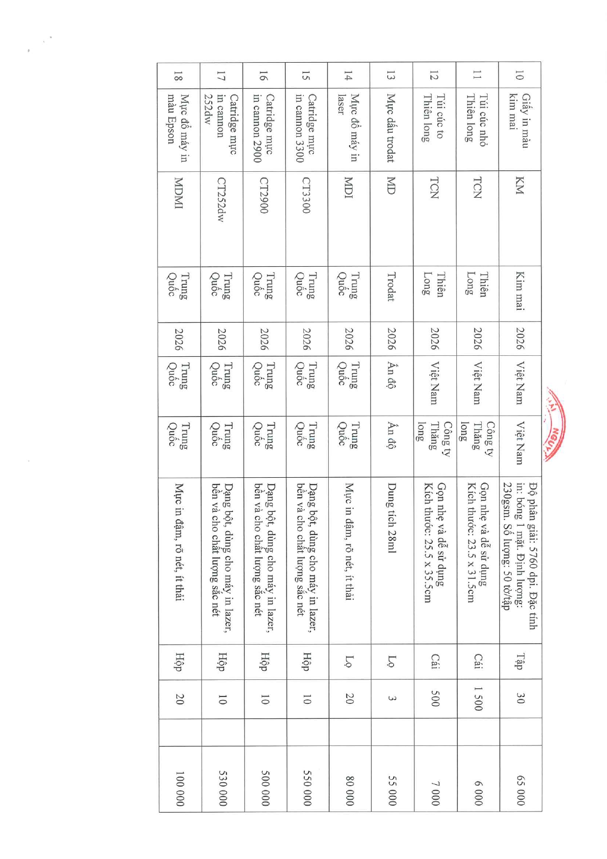 • Bảng giá vật tư