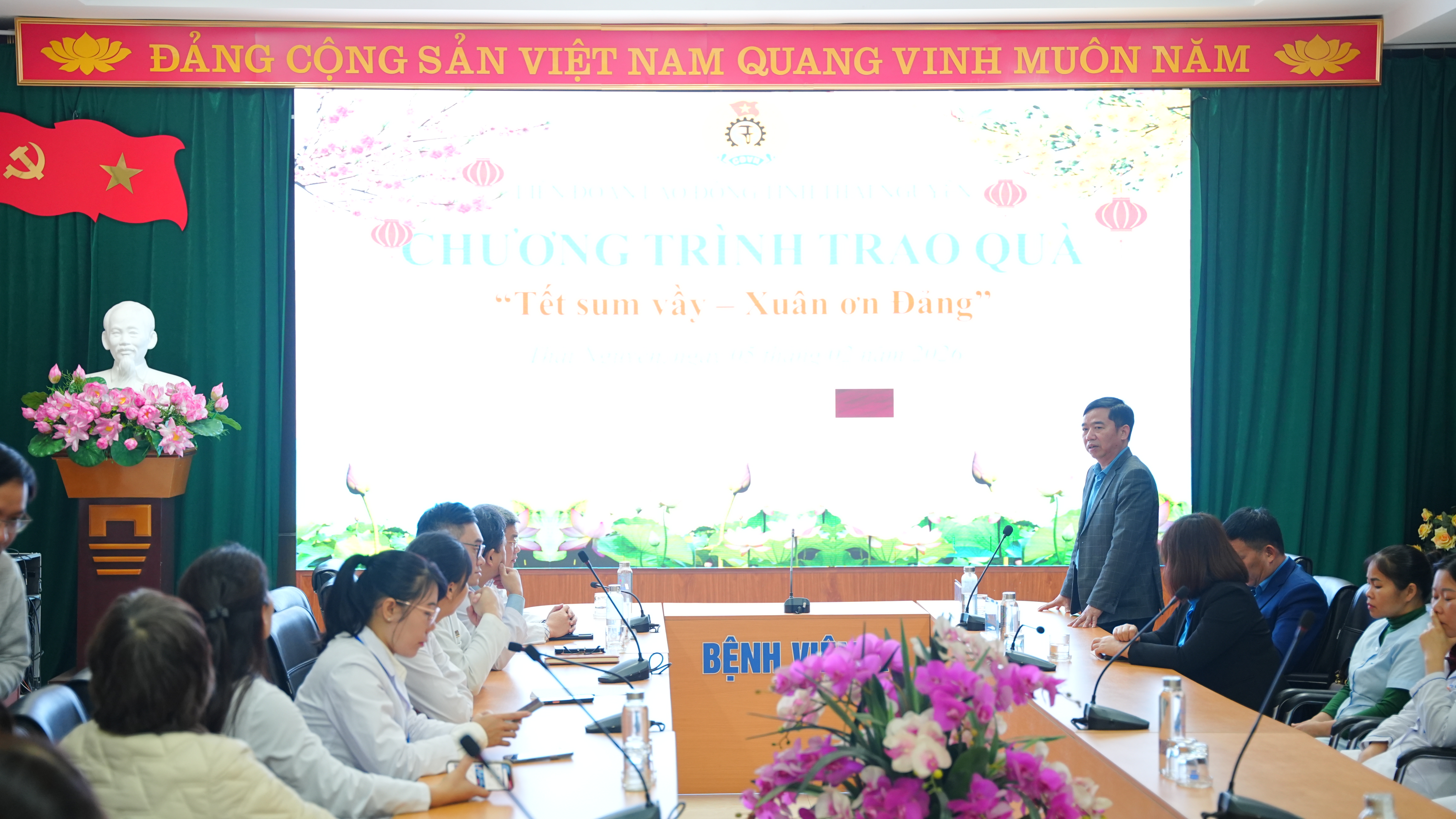 Tại buổi thăm hỏi, lãnh đạo Liên đoàn Lao động tỉnh đã gửi lời chúc mừng năm mới tới toàn thể viên chức, người lao động và gia đình, đồng thời ghi nhận sự tận tâm, trách nhiệm và những nỗ lực vượt khó của đội ngũ cán bộ, nhân viên trong công tác chăm sóc, bảo vệ sức khỏe người bệnh. Đặc biệt, lãnh đạo Liên đoàn đánh giá cao tinh thần sẵn sàng làm việc, trực Tết của đội ngũ nhân viên y tế – những người luôn âm thầm hy sinh niềm vui sum vầy để đảm bảo công tác cấp cứu, điều trị cho người bệnh trong dịp Tết Nguyên đán.                   Đồng chí Đoàn Mạnh Thắng - Phó Chủ tịch LĐLĐ tỉnh Thái Nguyên phát biểu tại chương trình