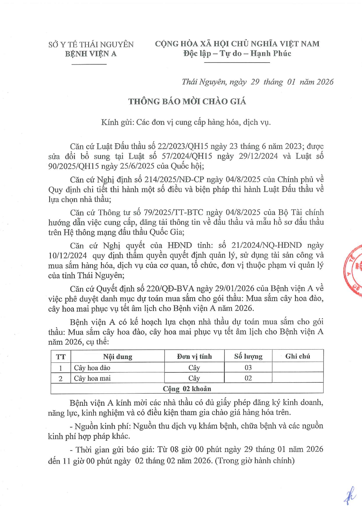 Thông báo mời chào giá gói thầu: Mua sắm cây hoa đào, cây hoa mai phục vụ tết âm lịch cho Bệnh viện A năm 2026