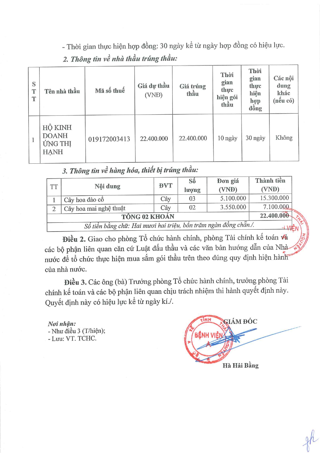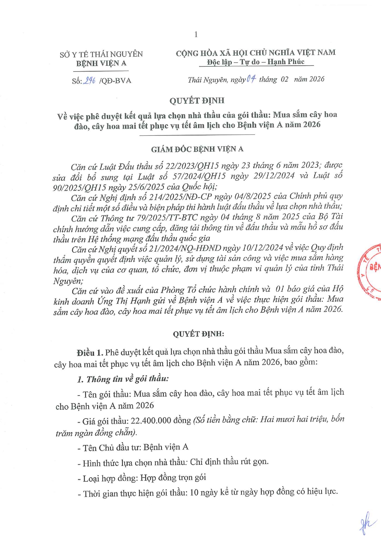 Quyết định về việc phê duyệt kết quả lựa chọn nhà thầu của gói thầu: Mua sắm cây hoa đào, cây hoa mai tết phục vụ tết âm lịch cho Bệnh viện A năm 2026