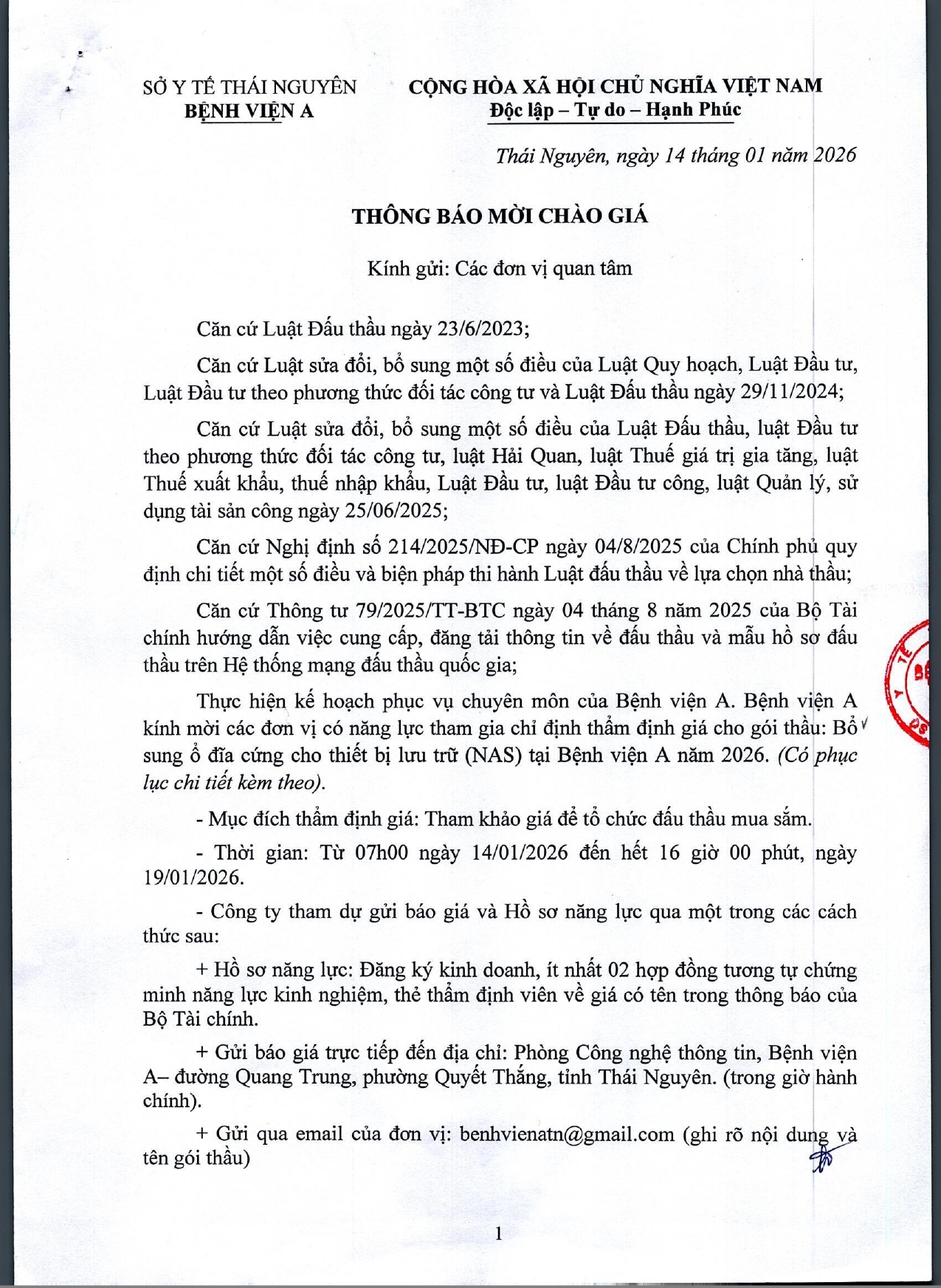 • Thông báo mời chào giá gói thầu: Chạy quảng cáo trên trang fanpage Bệnh viện A ( 22/04/2026)