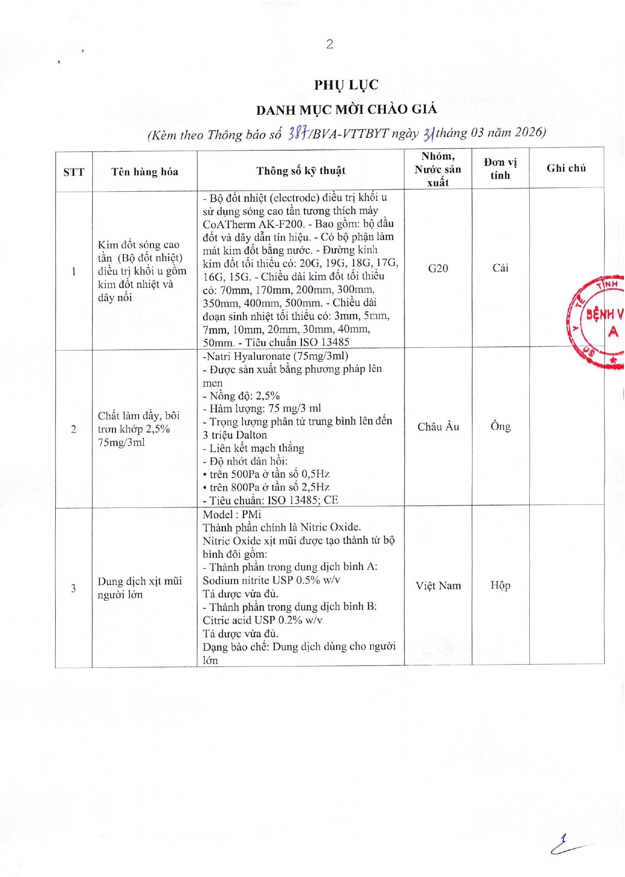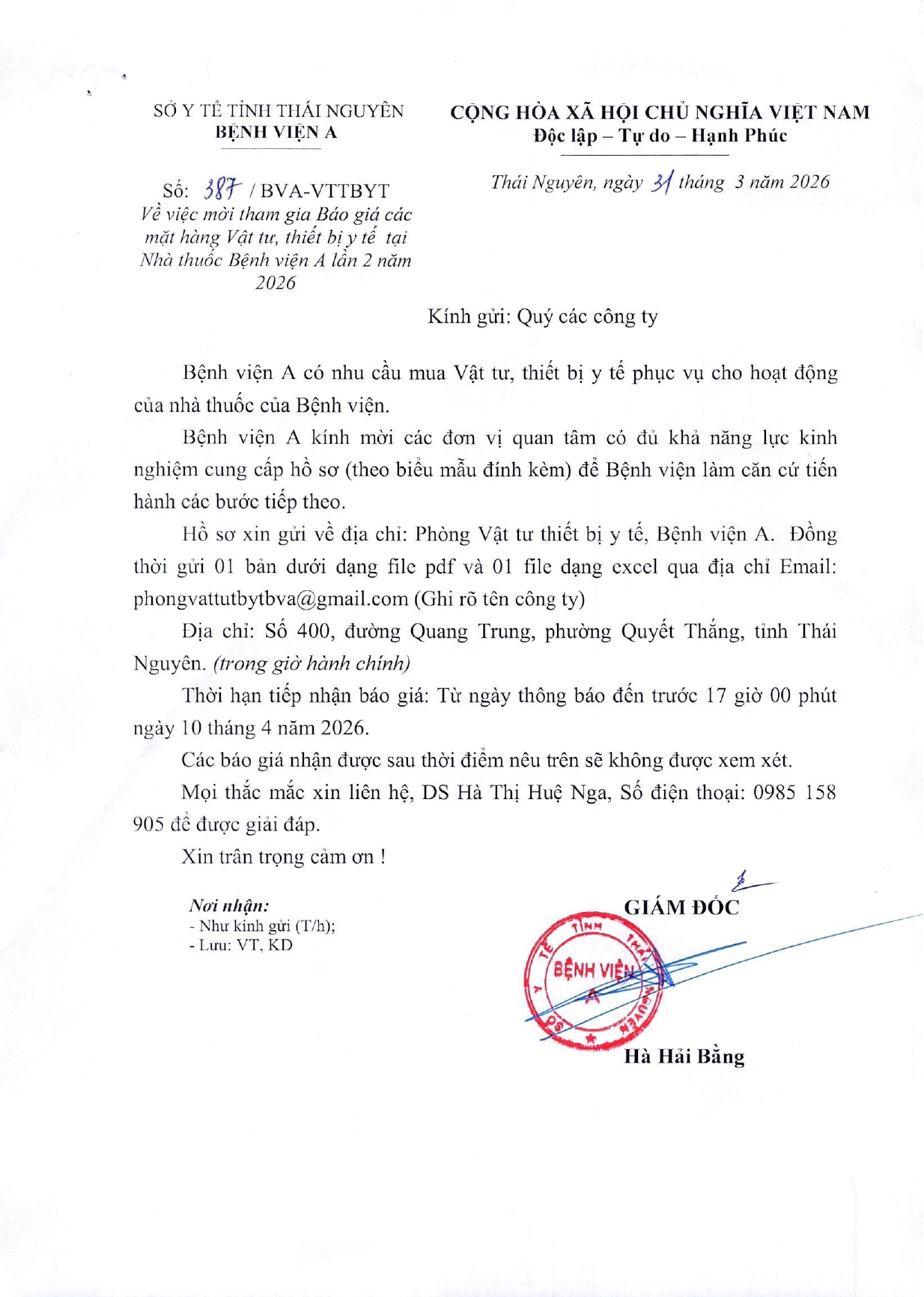 • Thông báo mời chào giá gói thầu: Mua sắm vật tư tiêu hao hành chính cho Bệnh viện A ( 18/03/2026)