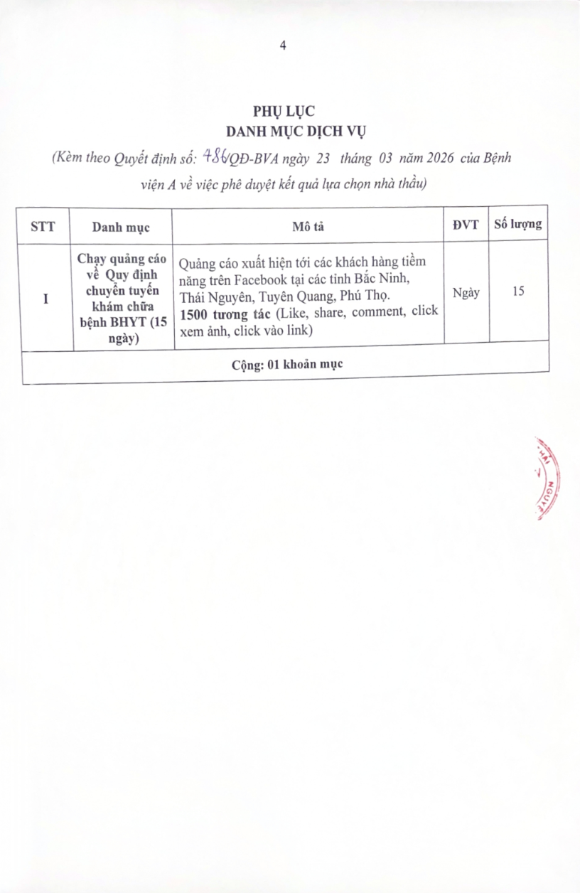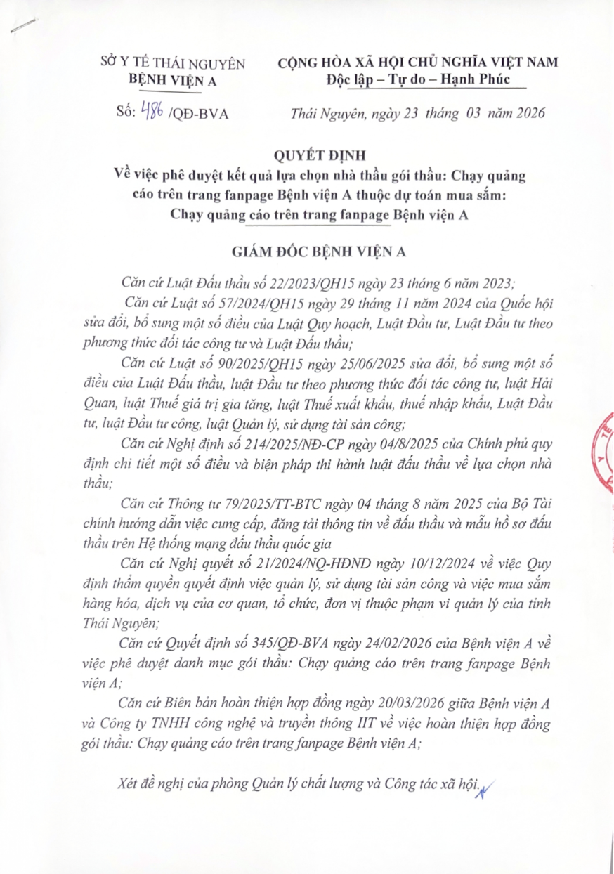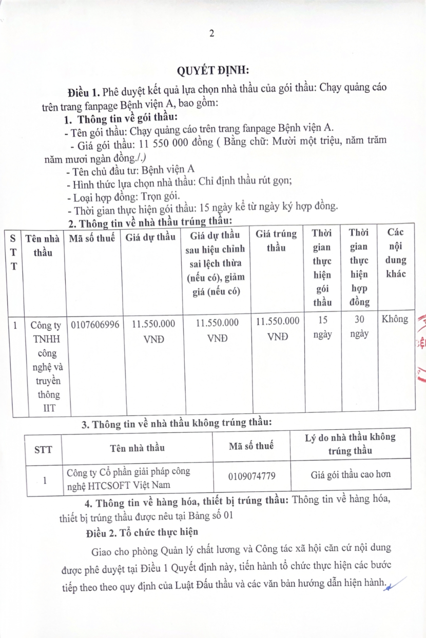Quyết định về việc phê duyệt kết quả lựa chọn nhà thầu gói thầu: Chạy quảng cáo trên trang fanpage Bệnh viện A