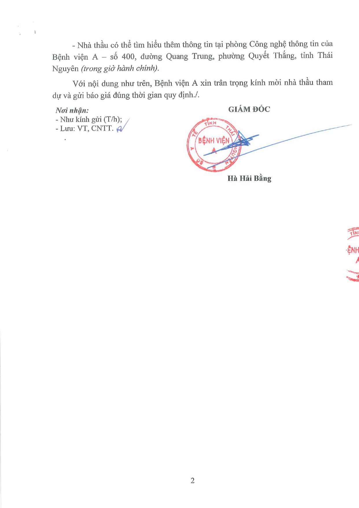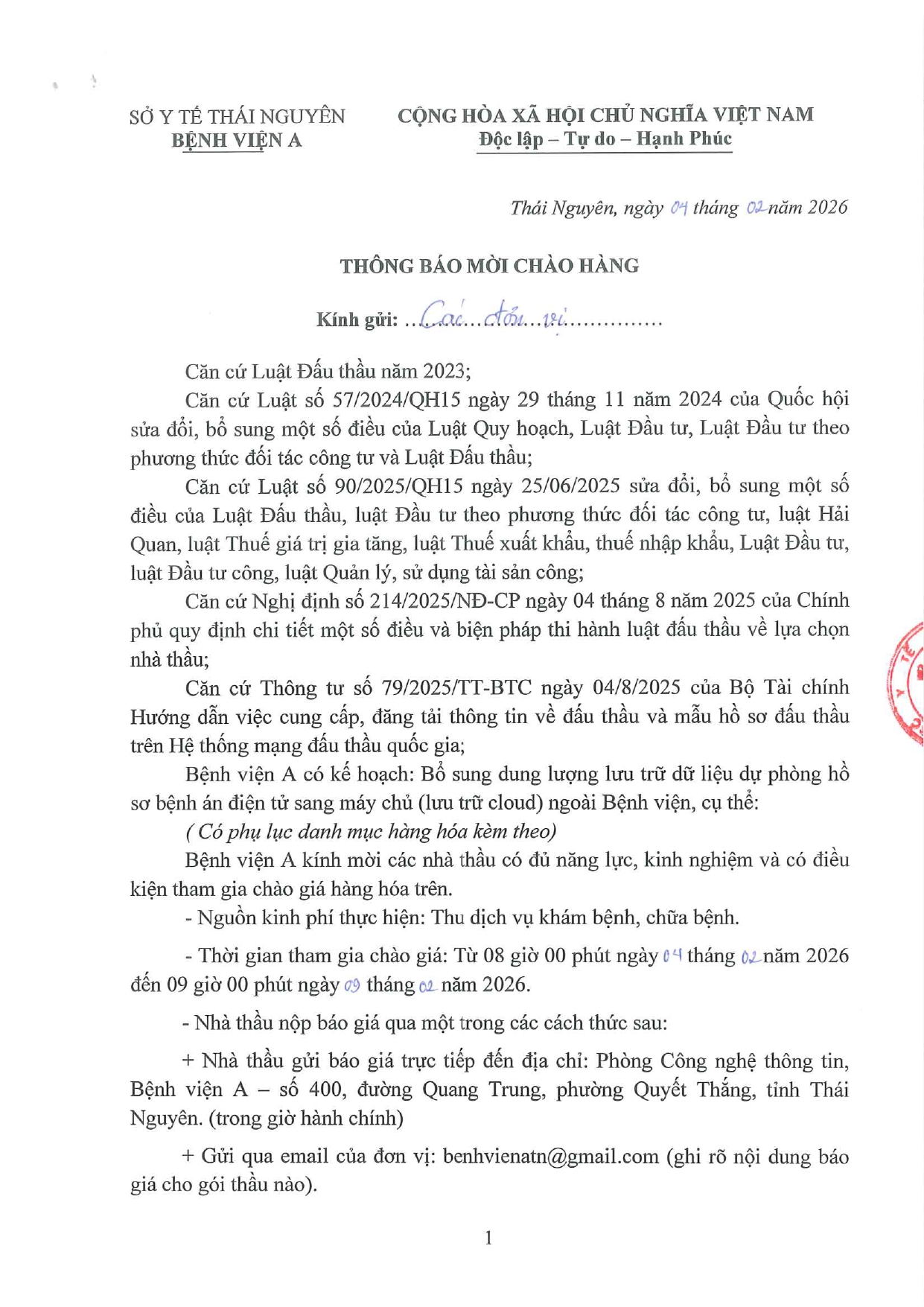 • Thông báo chào giá gói thầu: Mua sắm thiết bị công nghệ thông tin để duy trì, vận hành hồ sơ bệnh án điện tử và triển khai Bệnh viện số năm 2026 ( 20/04/2026)