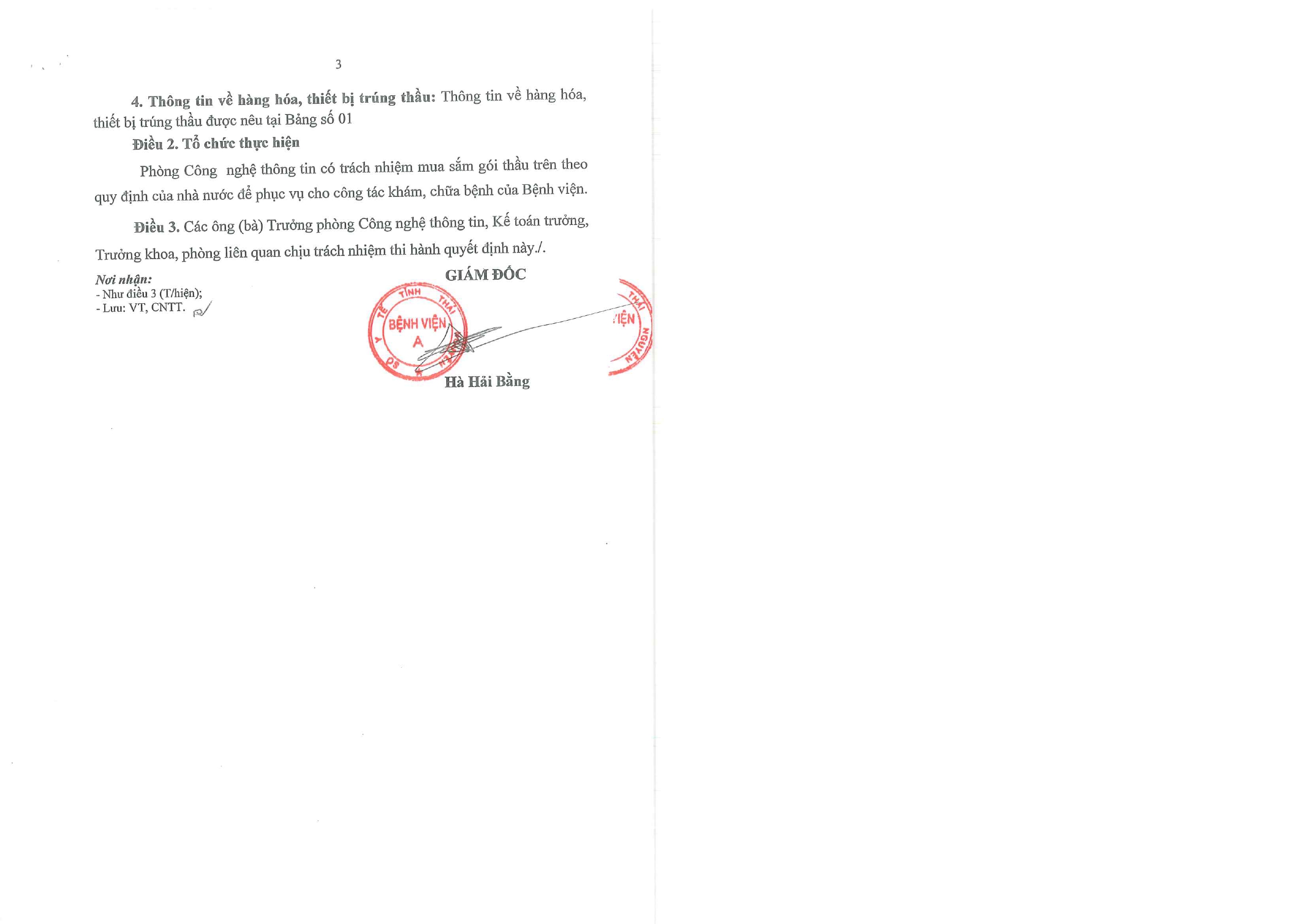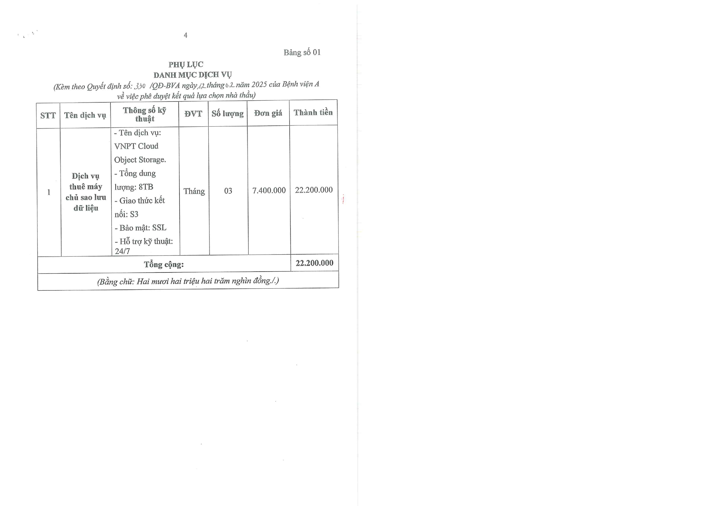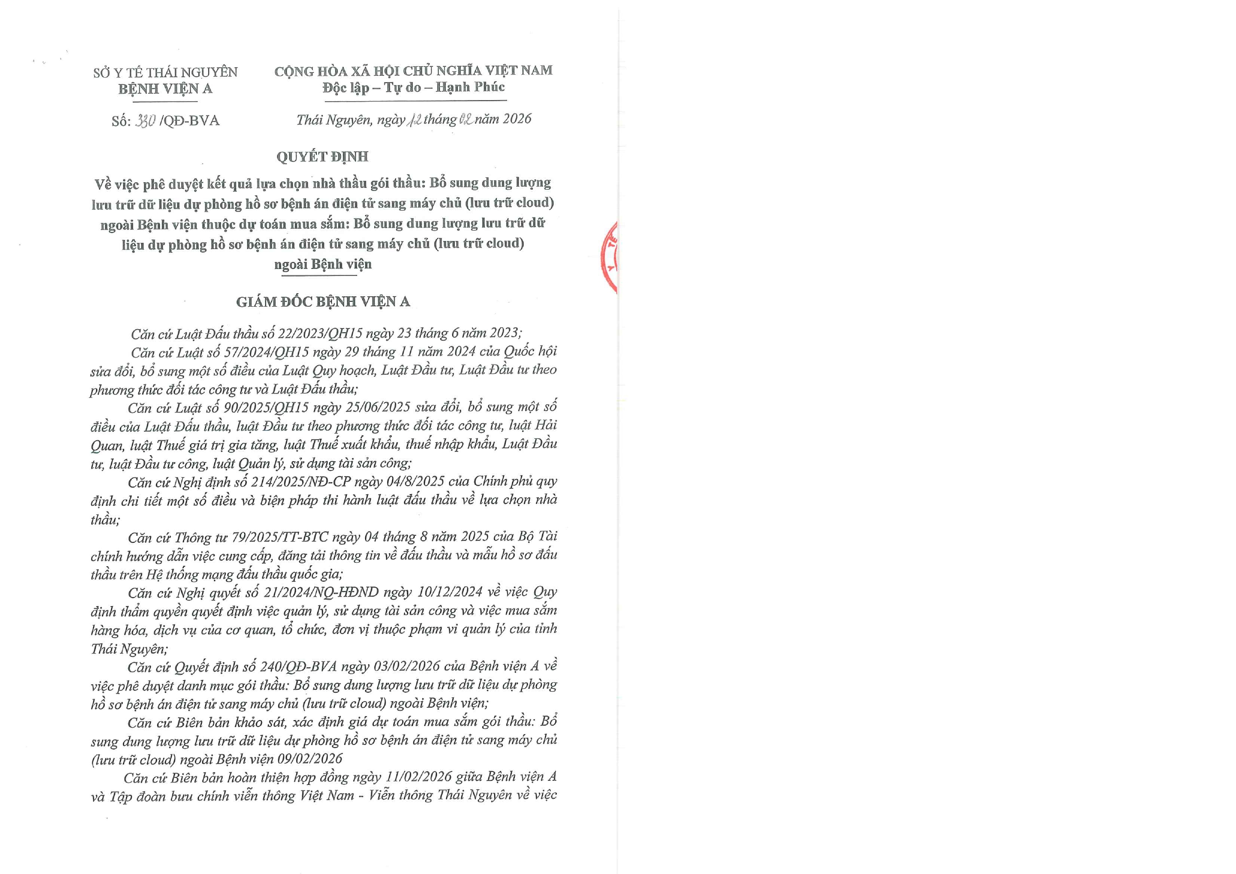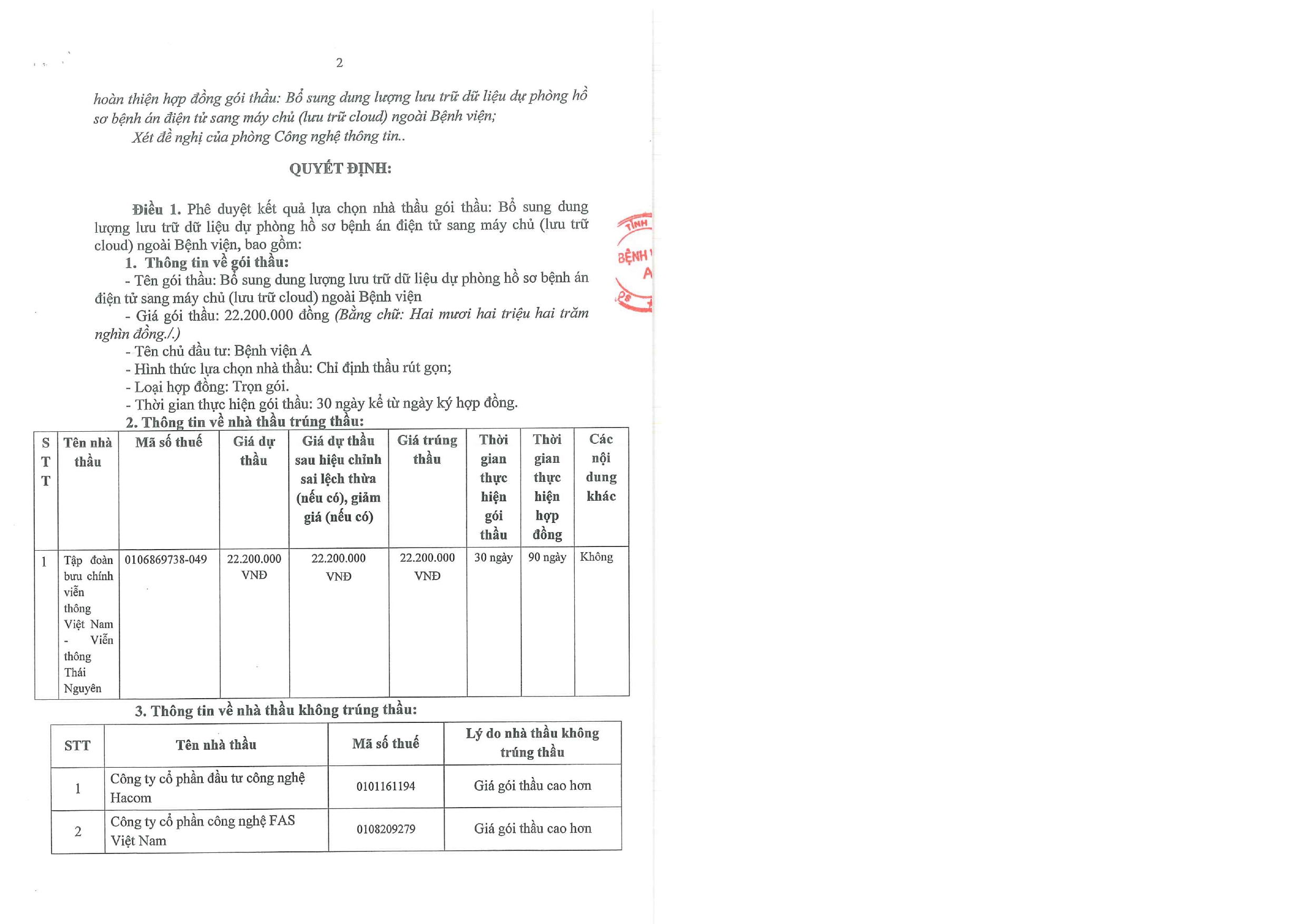 Quyết định về việc phê duyệt kết quả lựa chọn nhà thầu gói thầu: Bổ sung dung Lượng lưu trữ dữ liệu dự phòng hồ sơ bệnh án điện tử sang máy chủ ngoài Bệnh viện