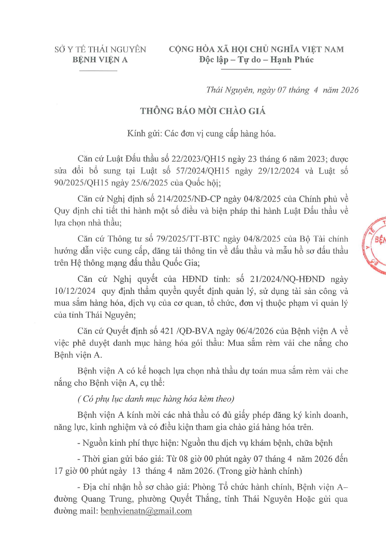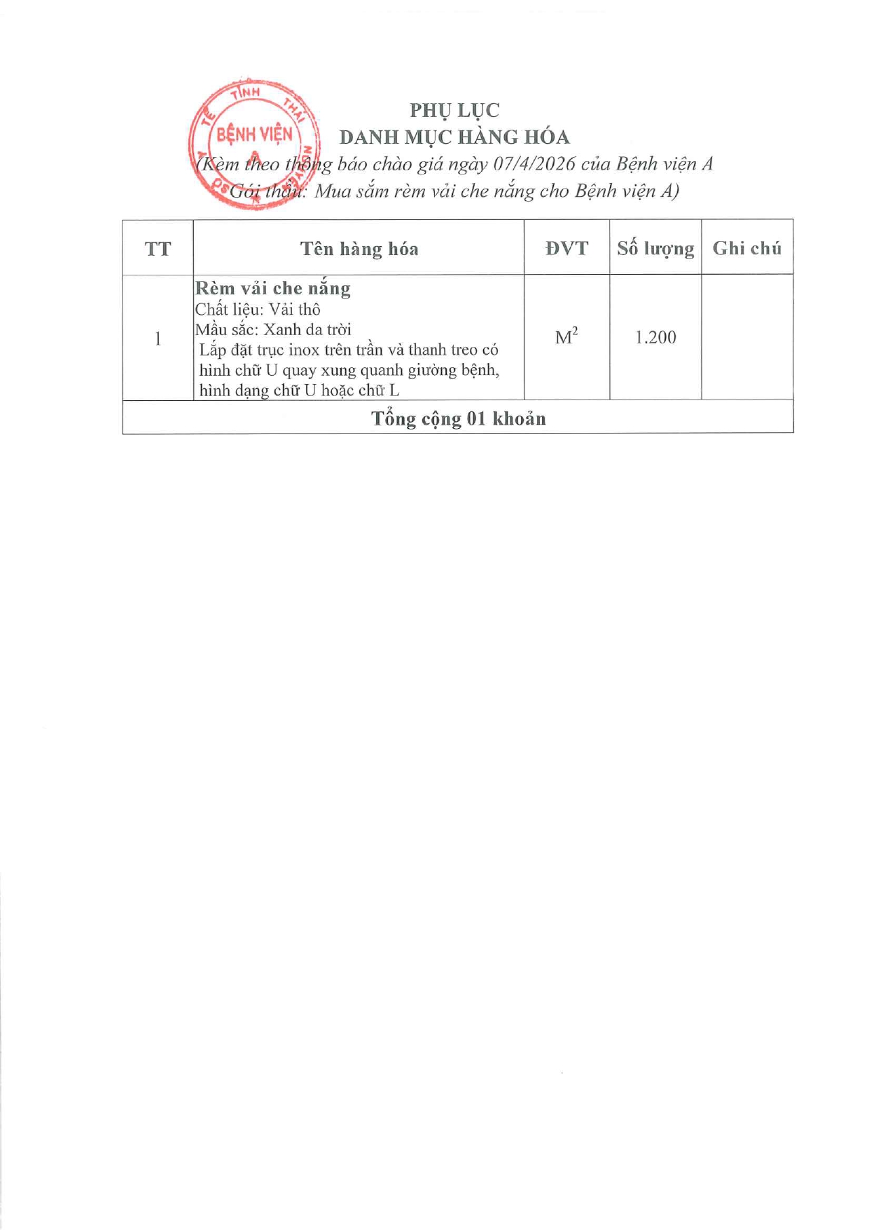 Thông báo chào giá gói thầu: Mua sắm rèm vải che nắng cho Bệnh viện A