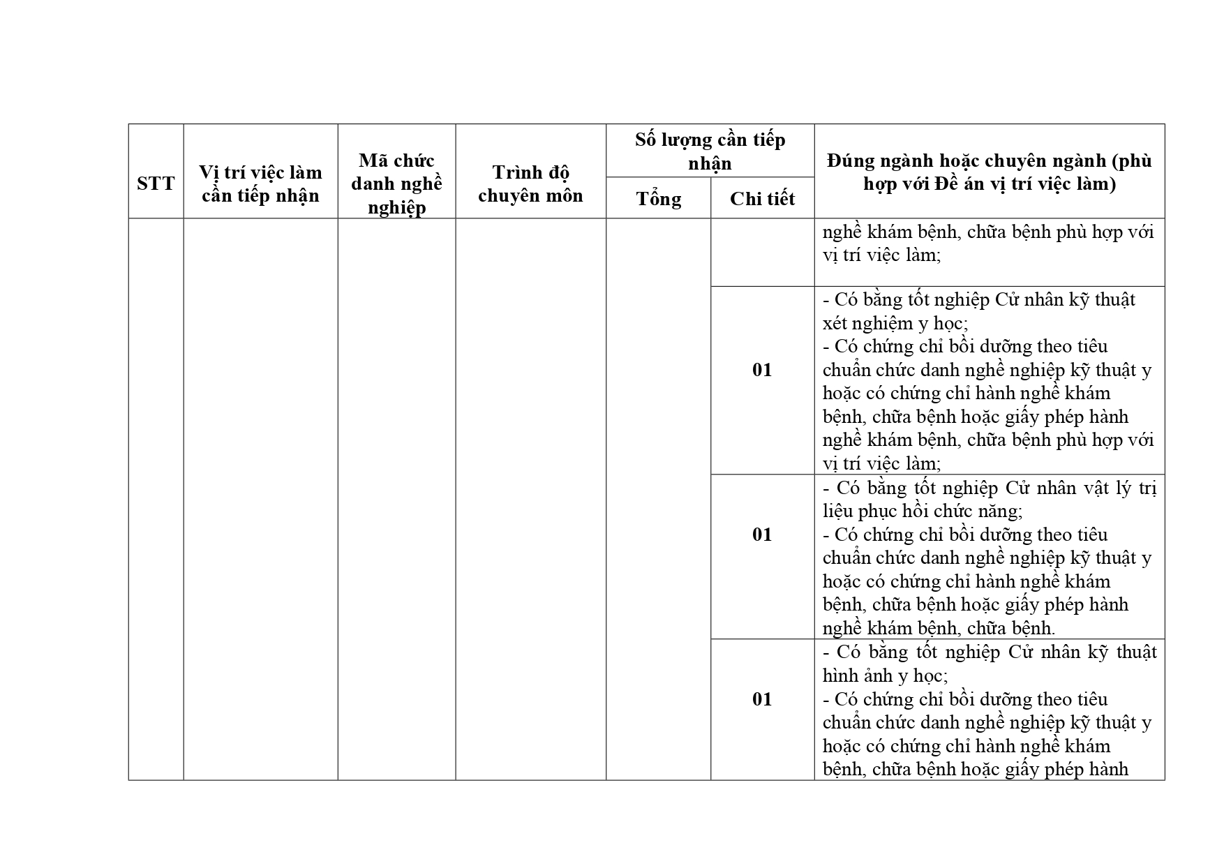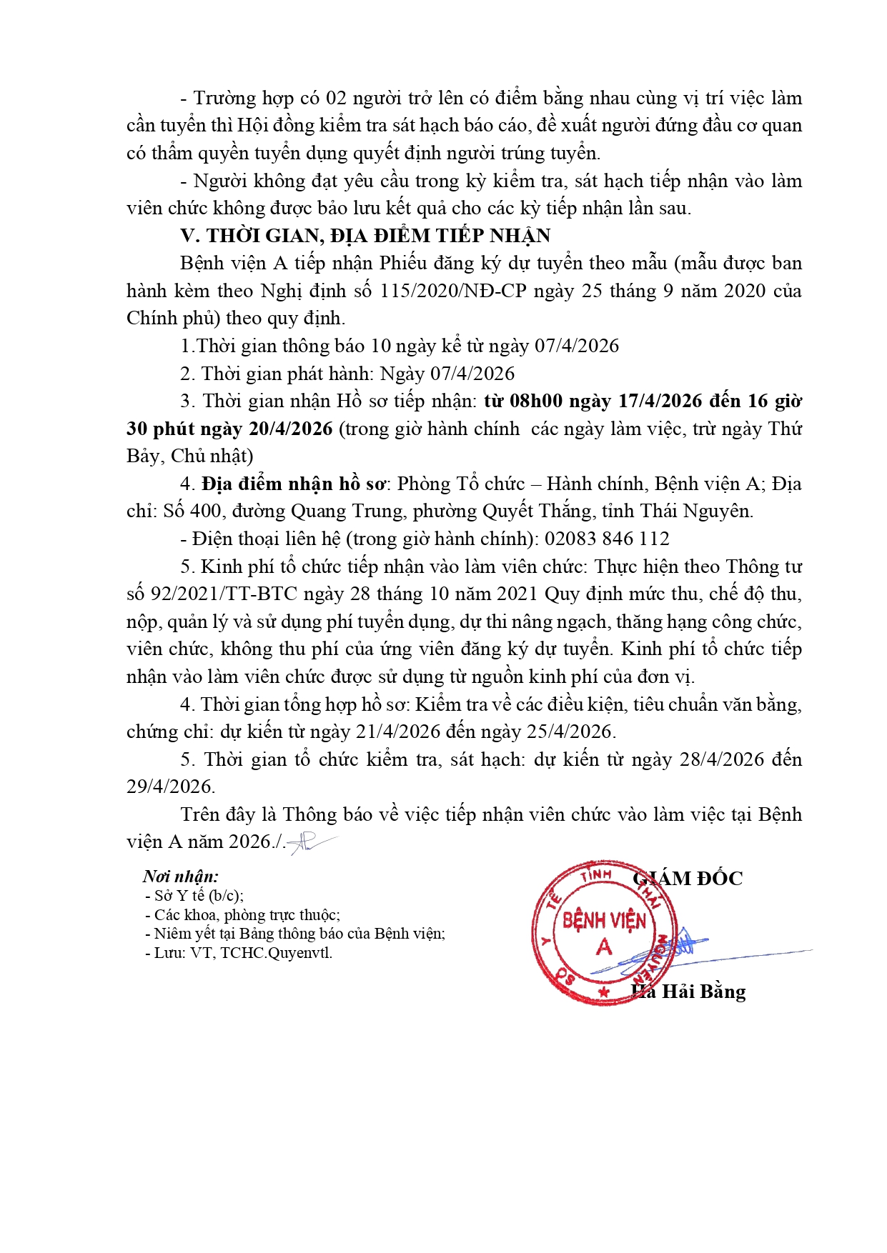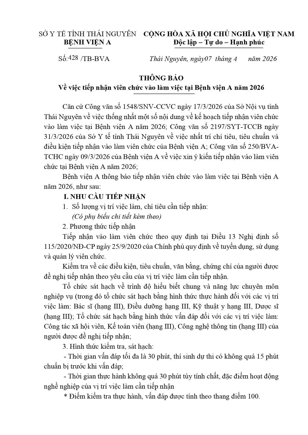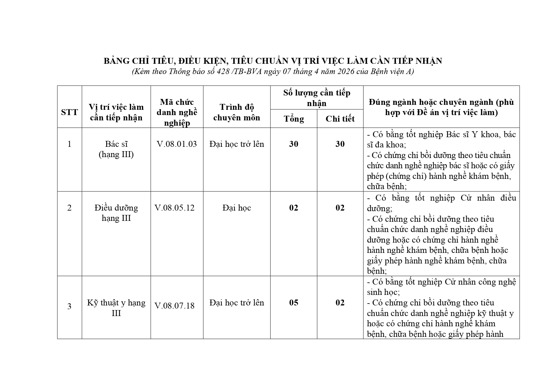 Thông báo về việc tiếp nhận viên chức vào làm việc tại Bệnh viện A năm 2026