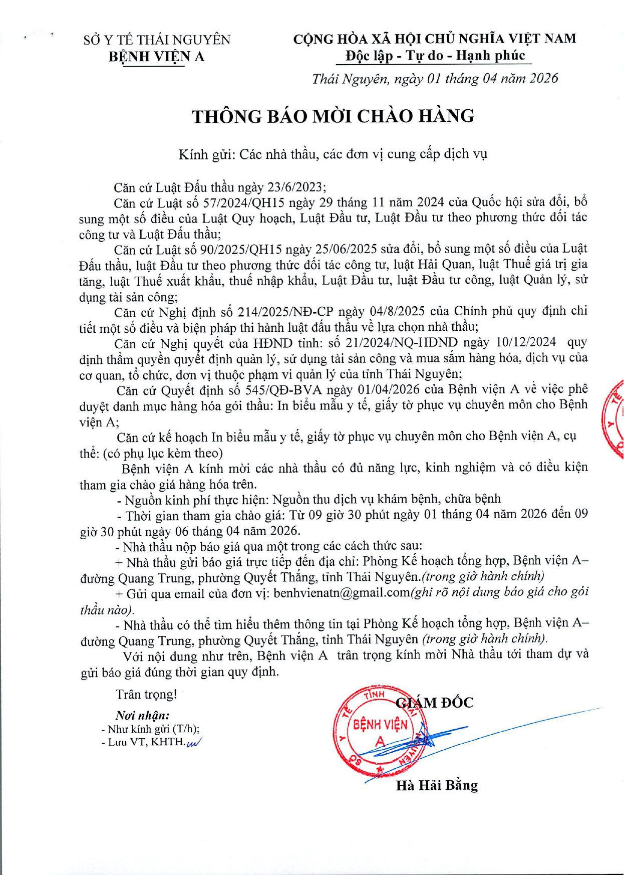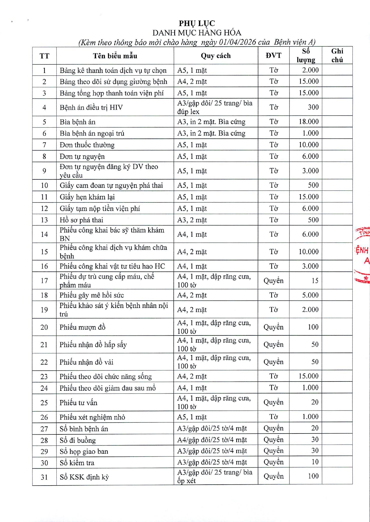 Thông báo mời chào giá gói thầu: In biểu mẫu y tế, giấy tờ phục vụ chuyên môn cho Bệnh viện A