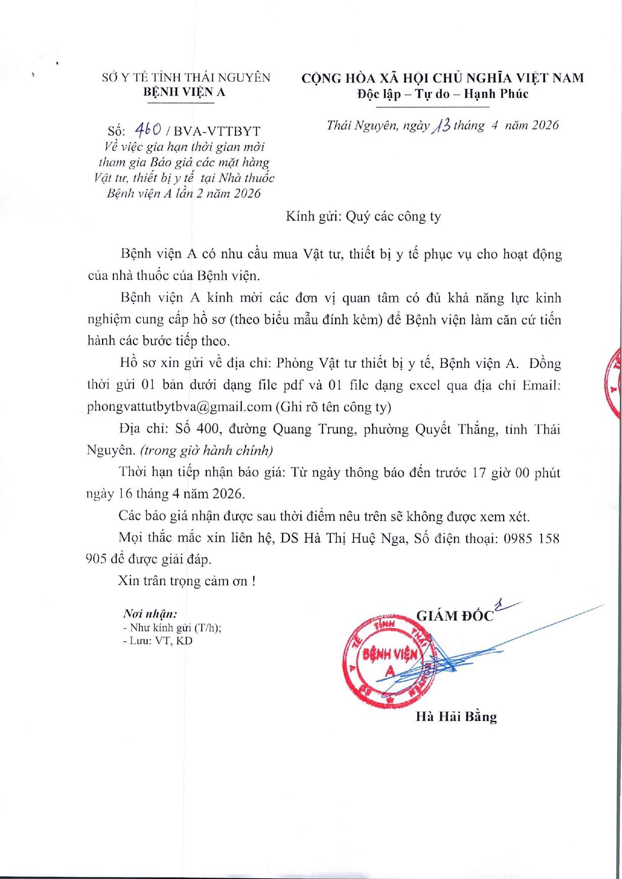 • Thông báo mời chào giá gói thầu: Mua vật tư, thiết bị y tế phục vụ cho hoạt động của nhà thuốc Bệnh viện ( 31/03/2026)