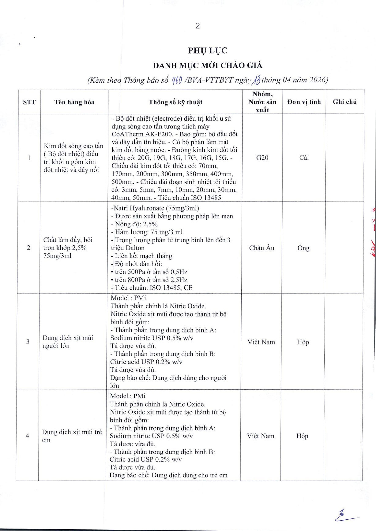 • Thông báo mời chào giá gói thầu: Mua bộ bơm xi măng tạo hình thân đốt sống có bóng phục vụ khám chữa bệnh của Bệnh viện A ( 10/04/2026)