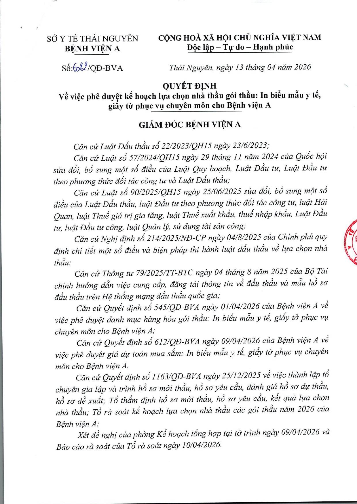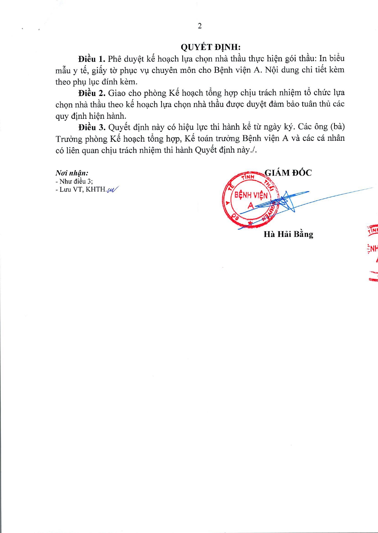 Quyết định về việc phê duyệt kế hoạch lựa chọn nhà thầu: In biểu mẫu y tế, giấy tờ phục vụ chuyên môn cho Bệnh viện A