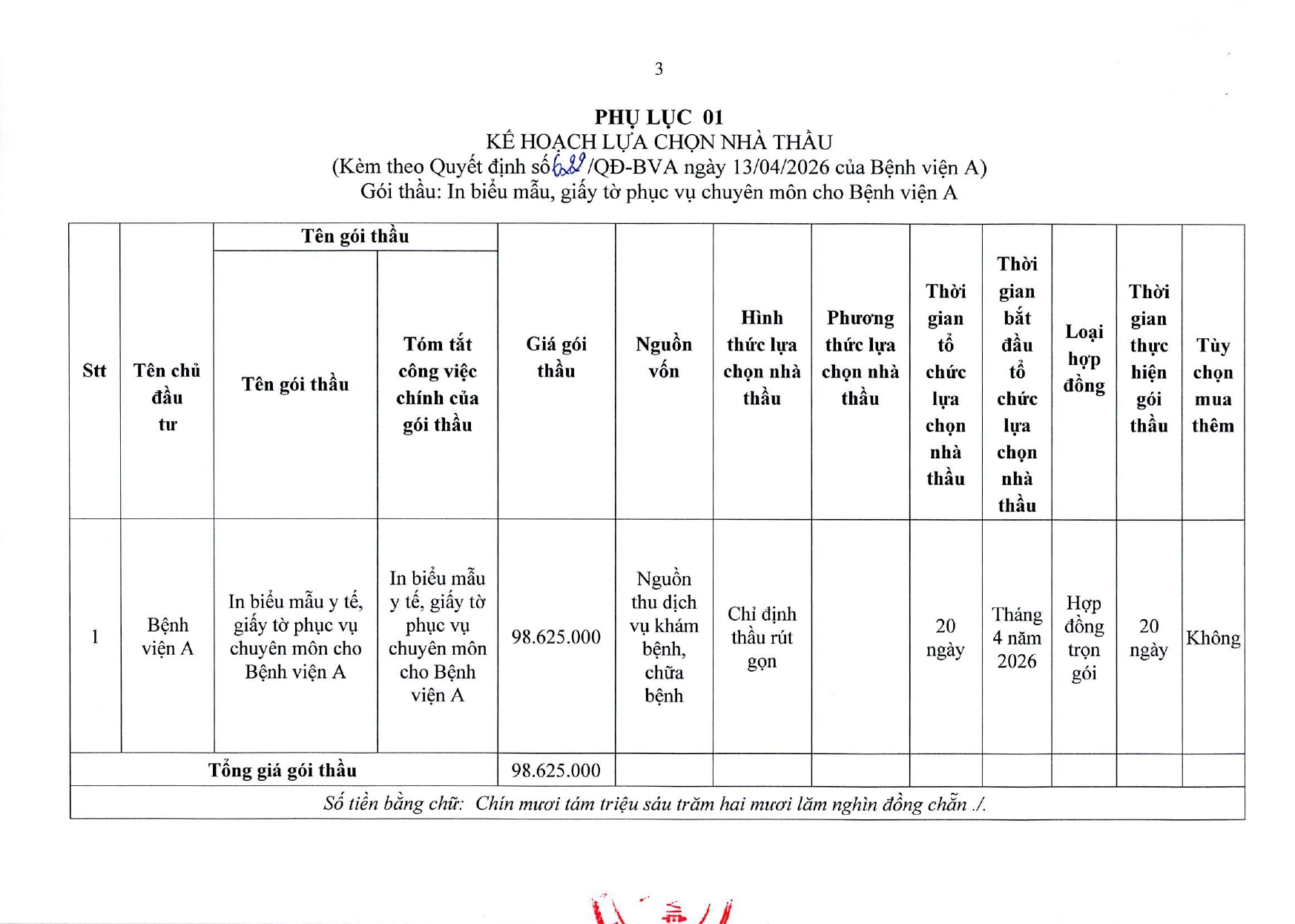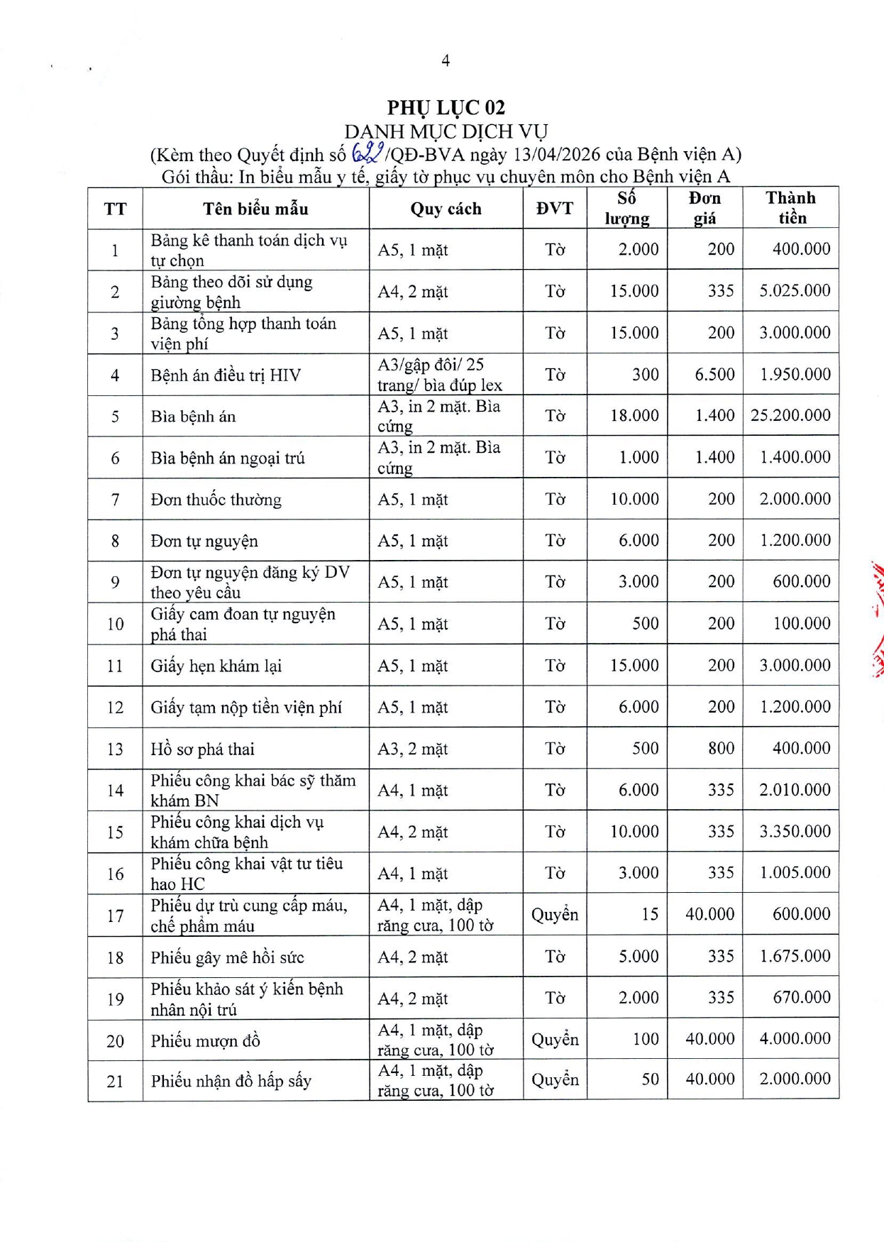 • Thông báo mời chào giá gói thầu: In biểu mẫu y tế, giấy tờ phục vụ chuyên môn cho Bệnh viện A ( 01/04/2026)