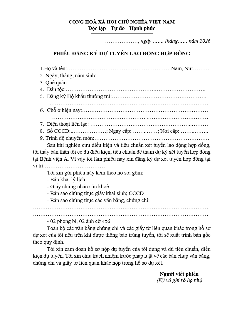 Thông báo tuyền dụng hợp đồng lao động chuyên môn, nghiệp vụ theo Nghị định số 111/2022/NĐ-CP tại Bệnh viện A đợt 1 năm 2026