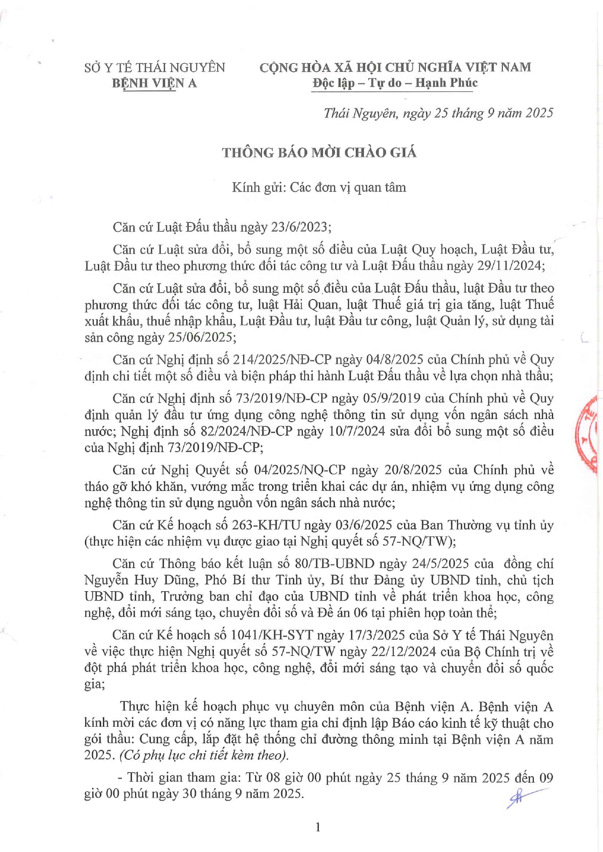 Thông báo mời chào giá gói thầu: Cung cấp, lắp đặt hệ thống chỉ đường thông minh tại Bệnh viện A năm 2025