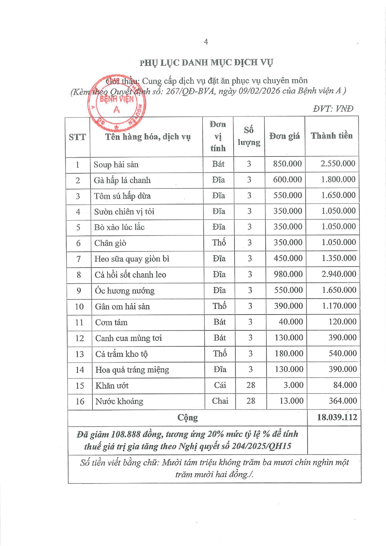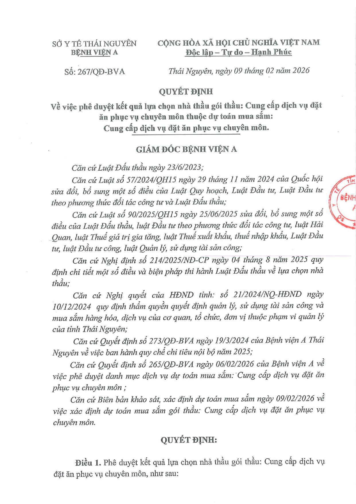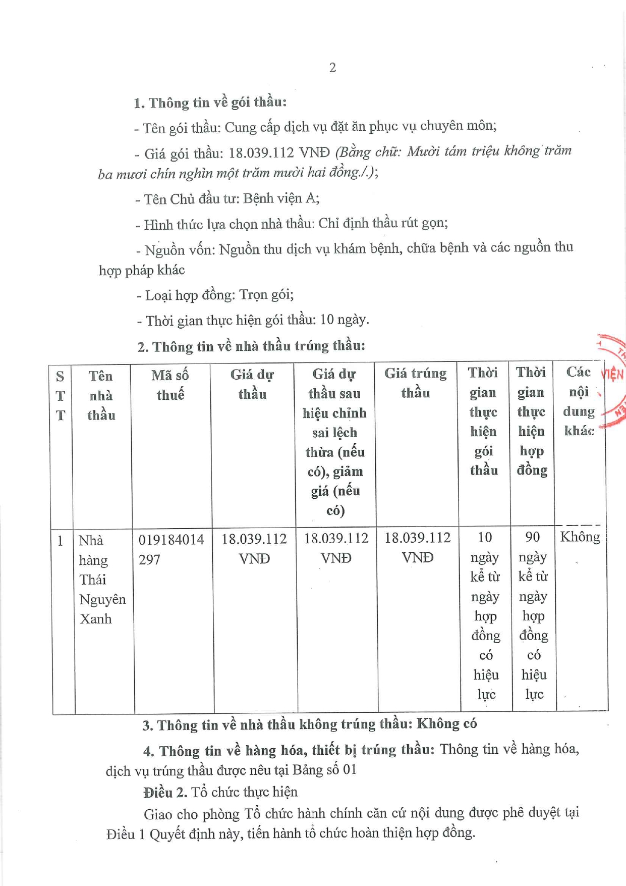 Quyết định về việc phê duyệt kết quả lựa chọn nhà thầu gói thầu: Cung cấp dịch vụ đặt ăn phục vụ chuyên môn