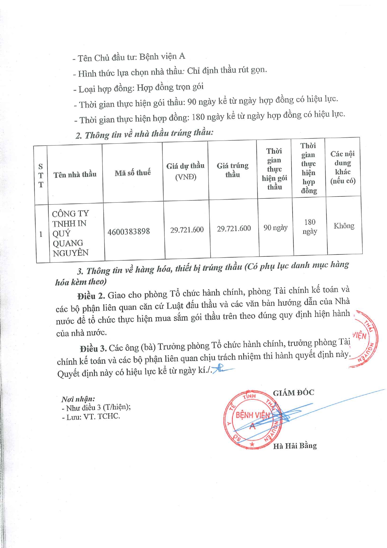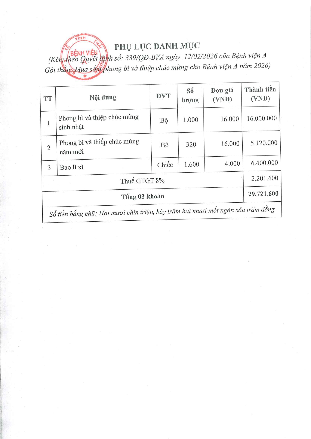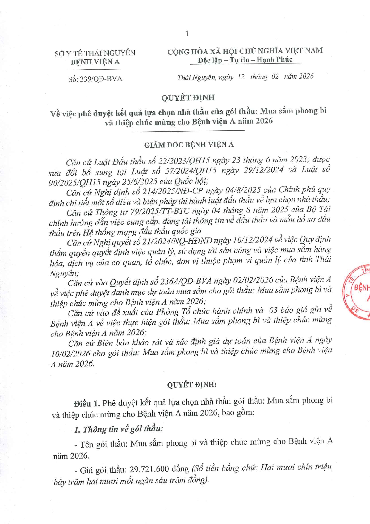 Quyết định về việc phê duyệt kết quả lựa chọn nhà thầu của gói thầu: Mua sắm phong bì và thiệp chúc mừng cho Bệnh viện A năm 2026