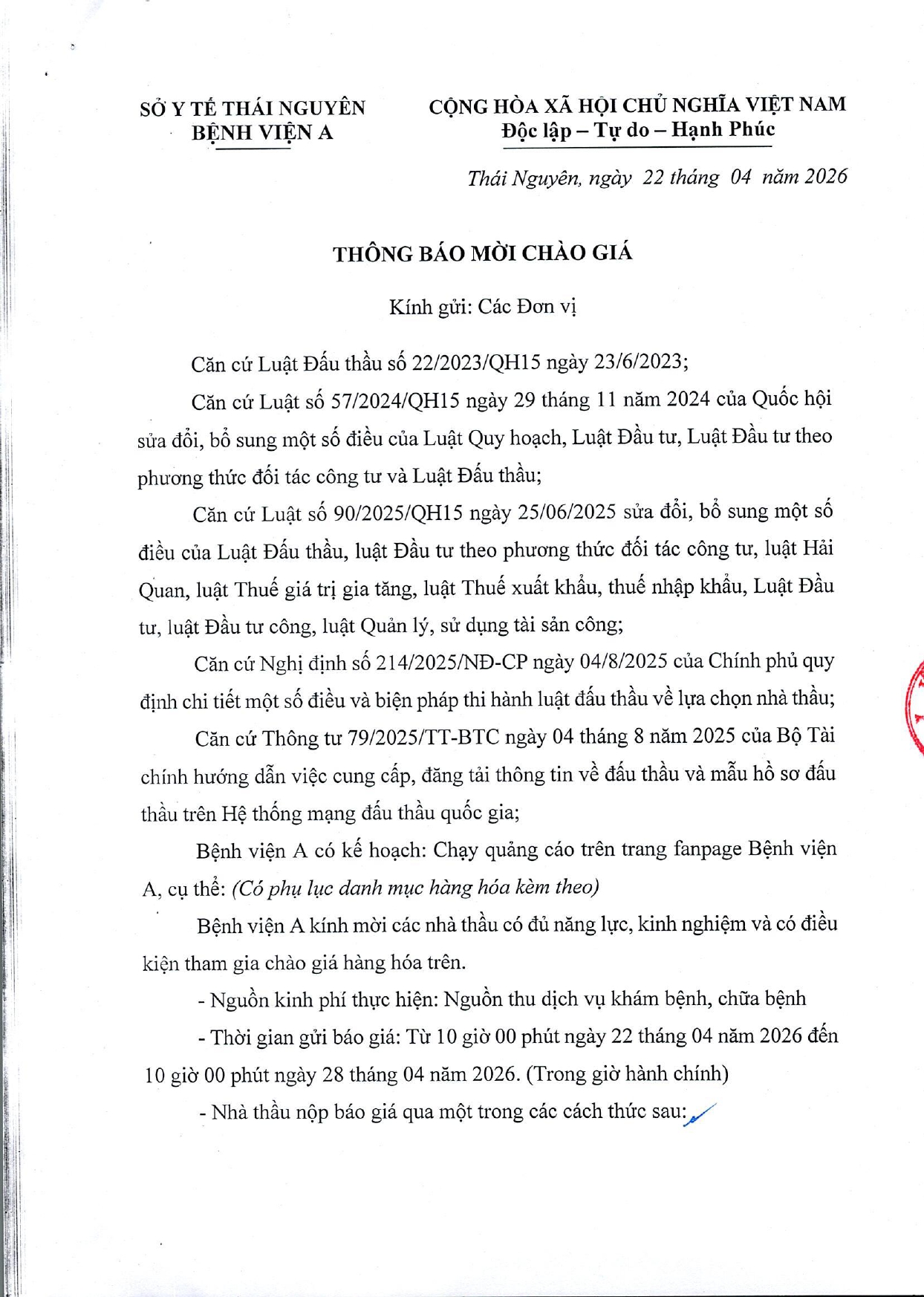 • Thông báo mời chào giá gói thầu: Mua bổ sung vật tư y tế sinh phẩm Quý II năm 2026 của Bệnh viện A ( 14/04/2026)