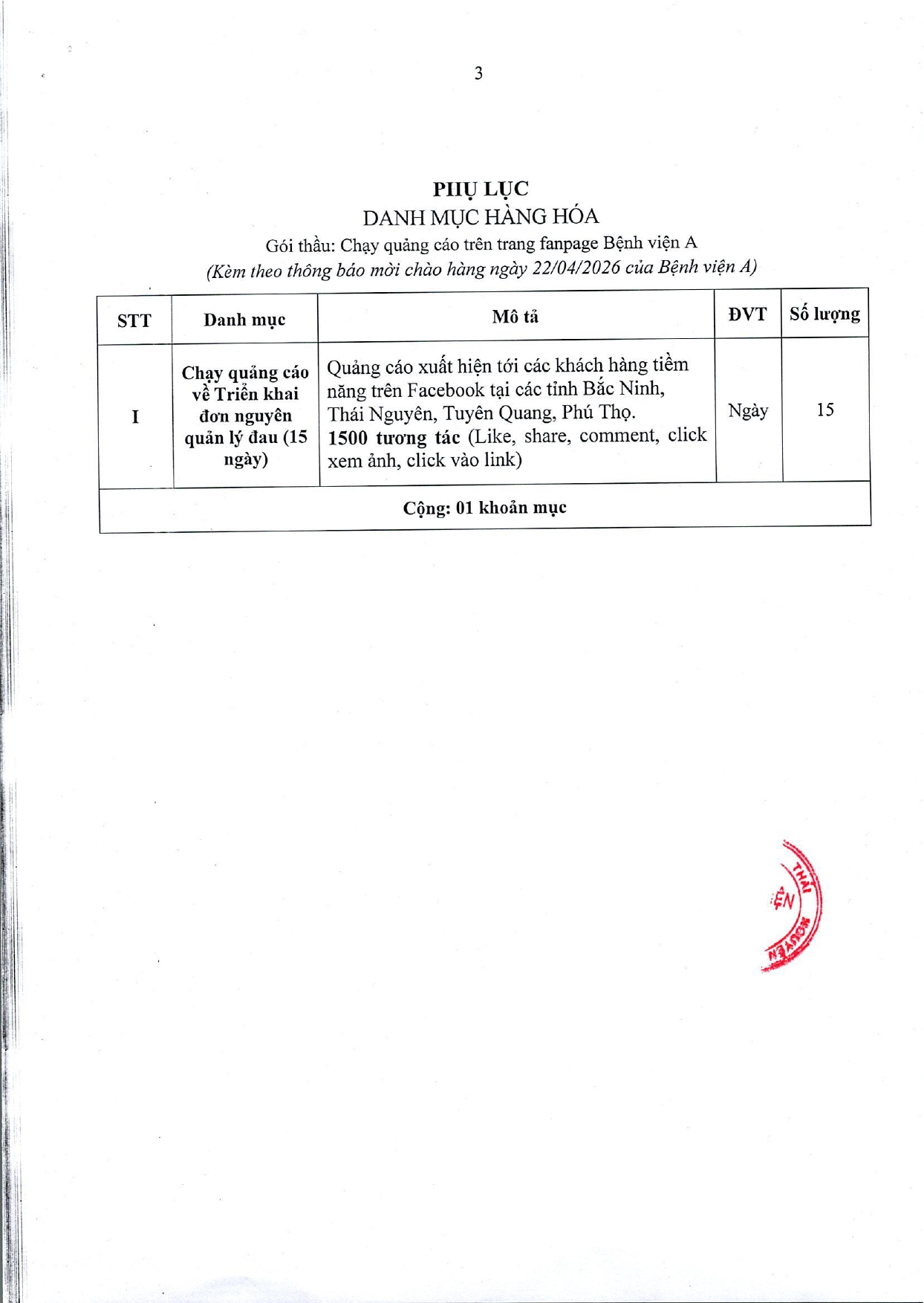Thông báo mời chào giá gói thầu: Chạy quảng cáo trên trang fanpage Bệnh viện A