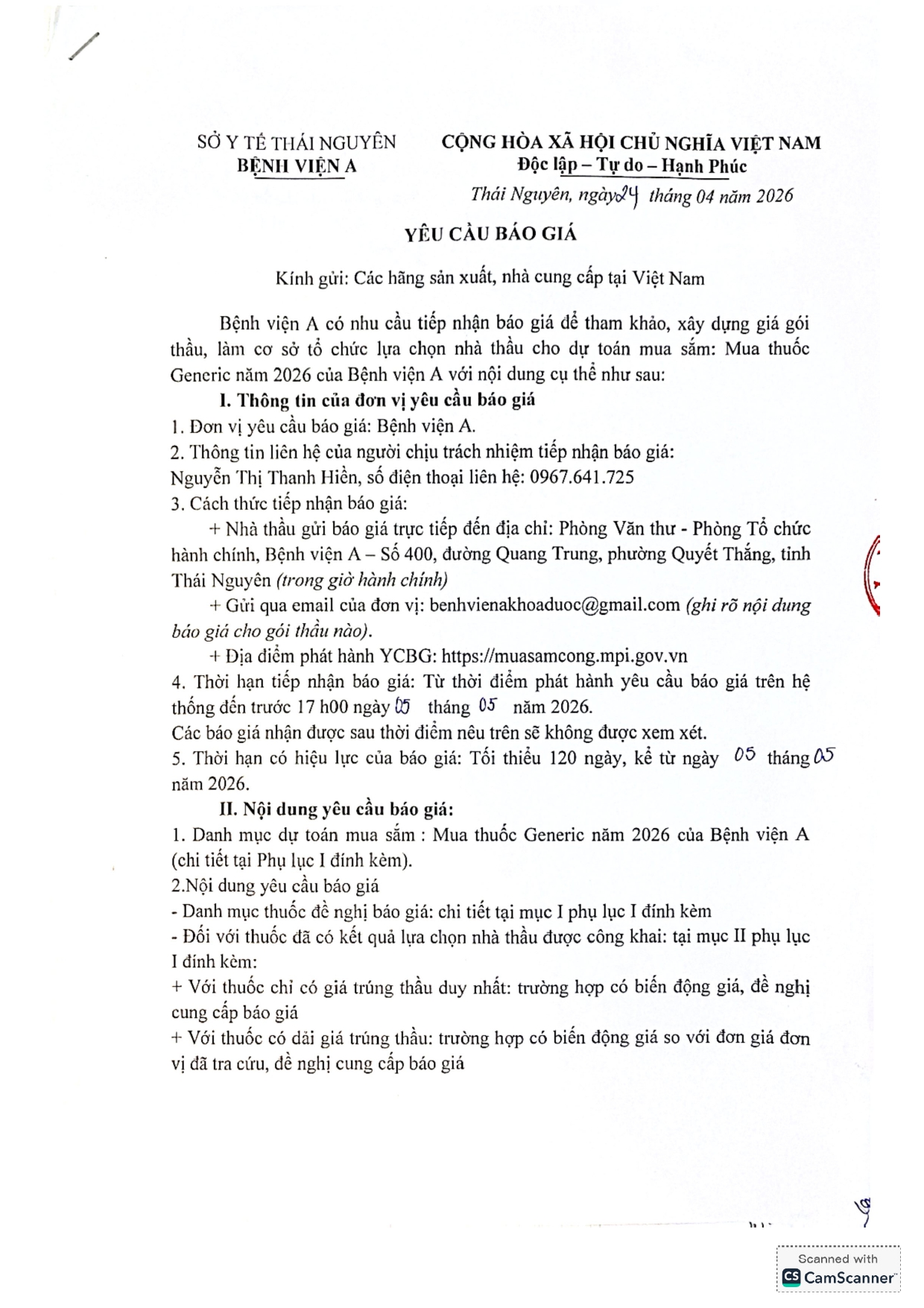 Thông báo yêu cầu báo giá gói thầu: Mua thuốc Generic năm 2026 của Bệnh viện A